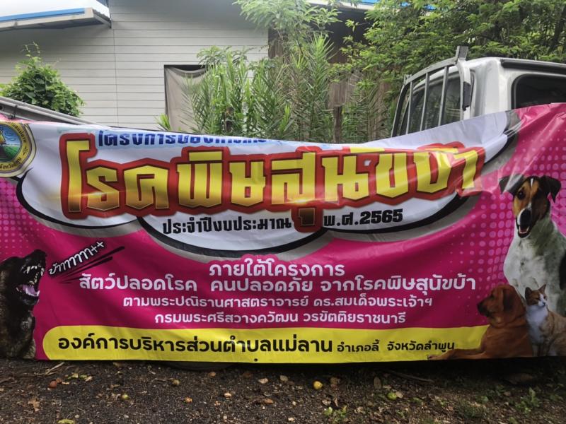 วันที่ 6 กันยายน 2565 องค์การบริหารส่วนตำบลแม่ลาน โดยนายโสภณ มีมัง นายกองค์การบริหารส่วนตำบลแม่ลาน มอบหมายให้เจ้าหน้าที่ สำนักปลัด ออกให้บริการฉีดวัคซีนป้องกันโรคพิษสุนัขบ้า ตามโครงการสัตว์ปลอดโรค คนปลอดภัย จากโรคพิษสุนัขบ้า ตามพระปณิธานศาสตราจารย์ ดร.สมเด็จพระเจ้าลูกเธอ เจ้าฟ้าจุฬาภรณวลัยลักษณ์ อัครราชกุมารี ประจำปีงบประมาณ พ.ศ.2565 ณ บ้านเด่นเหม้า หมู่ที่ 5 ตำบลแม่ลาน อำเภอลี้ จังหวัดลำพูน