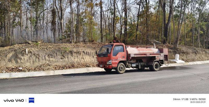 ลงพื้นที่นำรถบรรทุกน้ำดับไฟไหม้ บริเวณพื้นที่ป่าชุมชนบ้านเด่นเหม้า หมู่ที่ 5 ตำบลแม่ลาน อำเภอลี้ จังหวัดลำพูน
