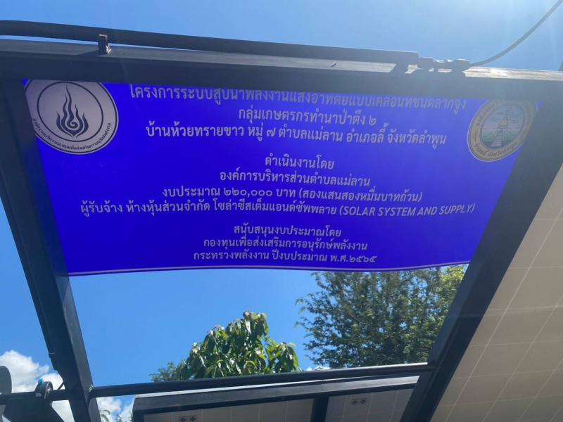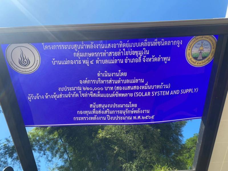 วันที่ 3 พฤศจิกายน 2566 องค์การบริหารส่วนตำบลแม่ลาน โดย นายโสภณ มีมัง นายกองค์การบริหารส่วนตำบลแม่ลาน มอบหมายให้ นายเสาร์คำ แก้วปลูก รองนายกองค์การบริหารส่วนตำบลแม่ลาน ร่วมกับเจ้าหน้าที่พลังงานจังหวัดลำพูน ลงพื้นที่ตรวจสอบประสิทธิภาพการทำงานของระบบสูบน้ำพลังงานแสงอาทิตย์แบบเคลื่อนที่ชนิดรากจูง ของบ้านแม่กองวะ หมู่ที่ 4 และบ้านห้วยทรายขาว หมู่ที่ 7 ตำบลแม่ลาน ดำเนินงานโดย องค์การบริหารส่วนตำบลแม่ลาน และได้รับงบประมาณสนับสนุนจากกองทุนเพื่อส่งเสริมการอนุรักษ์พลังงาน กระทรวงพลังงาน ในปีงบประมาณ พ.ศ.2565 สามกลุ่มคือ กลุ่มเกษตรกรทำสวนลำไยบ่อขุมเงิน บ้านแม่กองวะ หมู่ที่ 4 กลุ่มเกษตรกรทำนาป่าตึง 1 และกลุ่มเกษตรกรทำนาป่าตึง 2 บ้านห้วยทรายขาว หมู่ที่ 7 ตำบลแม่ลาน อำเภอลี้ จังหวัดลำพูน