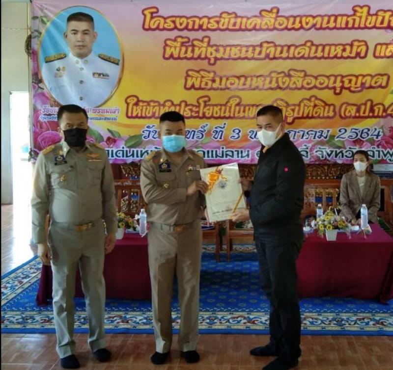 วันที่ 3 พฤษภาคม 2564 นายกุศล ยะทา นายกองค์การบริหารส่วนตำบลแม่ลาน พร้อมด้วยนายวิวัฒน์ จันทร์โอภาส นายอำเภอลี้ และนายวรยุทธ เนาวรัตน์ ผู้ว่าราชการจังหวัดลำพูน ให้การต้อนรับนายธรรมนัส พรหมเผ่า รัฐมนตรีช่วยว่าการกระทรวงเกษตรและสหกรณ์ ในการดำเนินโครงการงานขับเคลื่อนการแก้ไขปัญหาพื้นที่ชุมชนบ้สนเด่นเหม้า ตำบลแม่ลาน และพิธีมอบหนังสืออนุญาตให้เข้าทำประโยชน์ในพื้นที่เขตปฏิรูปที่ดิน (ศ.ป.ก. 4-01) ณ บ้านเด่นเหม้า ตำบลแม่ลาน อำเภอลี้ จังหวัดลำพูน