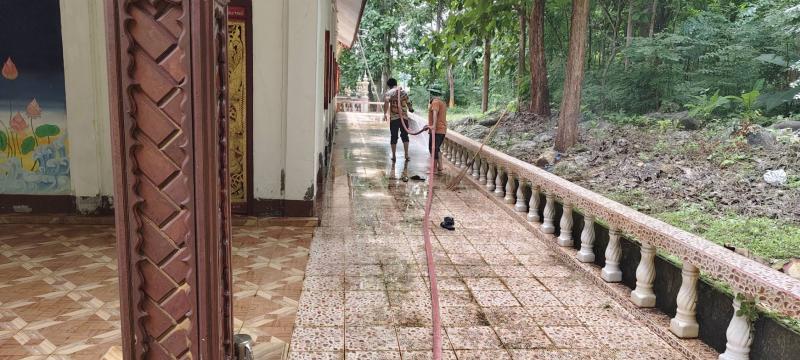 นำรถน้ำฉีดล้างทำความสะอาดวิหารวัดพระพุทธบาทผาผึ้ง บ้านผาต้าย หมู่ที่ 1 ตำบลแม่ลาน อำเภอลี้ จังหวัดลำพูน