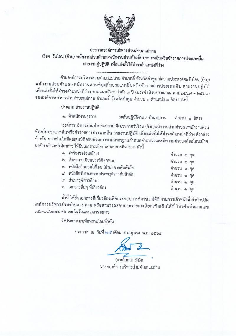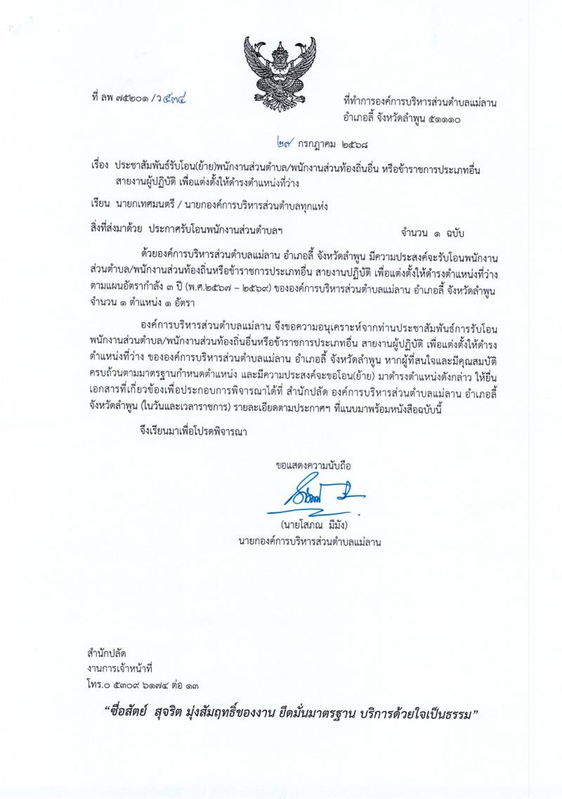 ประชาสัมพันธ์รับโอน(ย้าย)พนักงานส่วนตำบล/พนักงานส่วนตำบล/พนักงานส่วนท้องถิ่นอื่น หรือข้าราชการประเภทอื่น สายงานผู้ปฏิบัติ เพื่อแต่งตั้งให้ดำรงตำแหน่งที่ว่าง