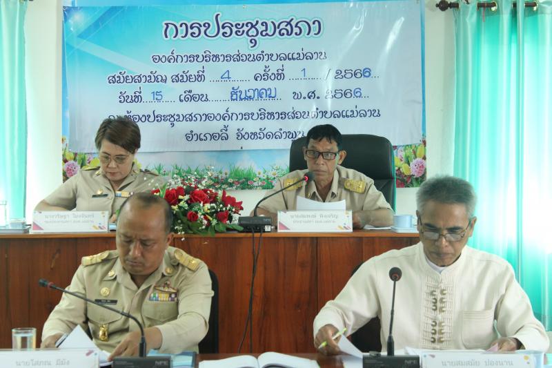 วันที่ 15 ธันวาคม 2566 เวลา 09.30 น. สภาองค์การบริหารส่วนตำบลแม่ลาน ได้ดำเนินการประชุมสภาสมัยสามัญ สมัยที่ 4 ครั้งที่ 1 ประจำปี 2566 เพื่อญัตติรายงานผลการติดตามและประเมินผลแผนพัฒนาองค์การบริหารส่วนตำบลแม่ลาน ประจำปีงบประมาณ 2566 รอบเดือนธันวาคม (เดือนตุลาคม 2565 - เดือนกันยายน 2566) ญัตติแผนพัฒนาท้องถิ่น(พ.ศ.2566 - 2570) เปลี่ยนแปลงครั้งที่ 1 ประจำปีงบประมาณ 2566 ในวาระที่ 5 และรายงานผลการปฏิบัติงานประจำปีงบประมาณ พ.ศ. 2566 ในวาระที่ 6 ณ ห้องประชุมองค์การบริหารส่วนตำบลแม่ลาน ชั้น 2 อำเภอลี้ จังหวัดลำพูน