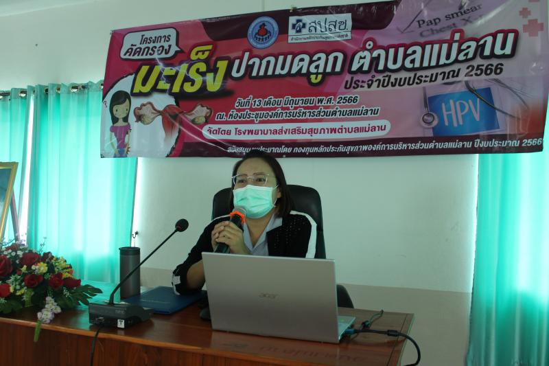 วันที่ 13 มิถุนายน 2566 องค์การบริหารส่วนตำบลแม่ลาน นำโดย นายโสภณ มีมัง นายกองค์การบริหารส่วนตำบลแม่ลาน เป็นประธานเปิดโครงการคัดกรองมะเร็งปากมดลูกตำบลแม่ลาน ประจำปีงบประมาณ 2566 จัดโดย โรงพยาบาลส่งเสริมสุขภาพตำบลแม่ลาน สนับสนุนงบประมาณโดย กองทุนหลักประกันสุขภาพองค์การบริหารส่วนตำบลแม่ลาน ปีงบประมาณ 2566 ณ ห้องประชุมองค์การบริหารส่วนตำบลแม่ลาน ชั้น 2 ตำบลแม่ลาน อำเภอลี้ จังหวัดลำพูน
