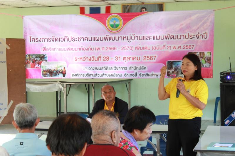 วันที่ 28 ตุลาคม 2567 เวลา 09.00 น. องค์การบริหารส่วนตำบลแม่ลาน นำโดย นายโสภณ มีมัง นายกองค์การบริหารส่วนตำบลแม่ลาน พร้อมด้วยคณะผู้บริหาร ข้าราชการ พนักงาน และเจ้าที่องค์การบริหารส่วนตำบลแม่ลาน ร่วมจัดโครงการจัดเวทีประชาคมทบทวนแผนพัฒนาหมู่บ้านและแผนพัฒนาประจำปี เพื่อจัดทำแผนท้องถิ่น (พ.ศ. 2566-2570) เพิ่มเติม (ฉบับที่ 2) พ.ศ. 2567 ขององค์การบริหารส่วนตำบลแม่ลาน ให้เป็นไปตามระเบียบกระทรวงมหาดไทย ว่าด้วยการจัดทำแผนพัฒนาขององค์กรปกครองส่วนท้องถิ่น พ.ศ.2548 แก้ไขเพิ่มเติม (ฉบับที่ 3) พ.ศ.2561 เป็นการส่งเสริมการมีส่วนร่วมของประชาชน ในการจัดทำแผนของชุมชน ณ บ้านผาต้ายเหนือ หมู่ที่ 6 ตำบลแม่ลาน อำเภอลี้ จังหวัดลำพูน