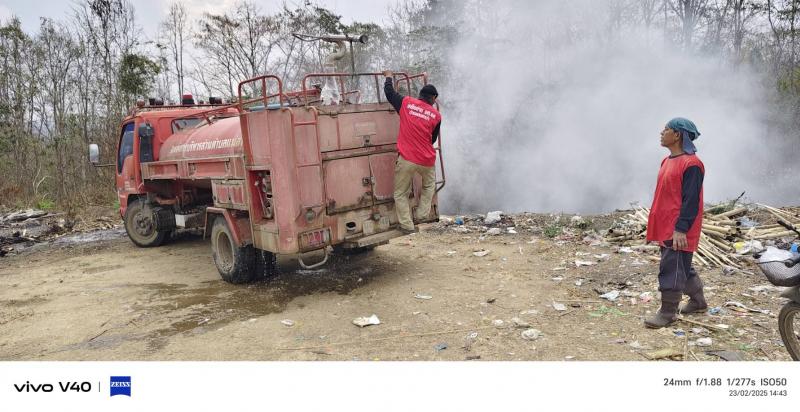 ลงพื้นที่นำรถบรรทุกน้ำดับไฟไหม้ บริเวณบ่อขยะบ้านเด่นเหม้า หมู่ที่ 5 ตำบลแม่ลาน อำเภอลี้ จังหวัดลำพูน