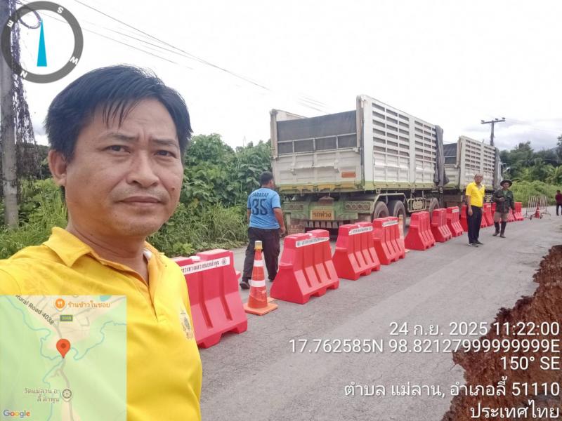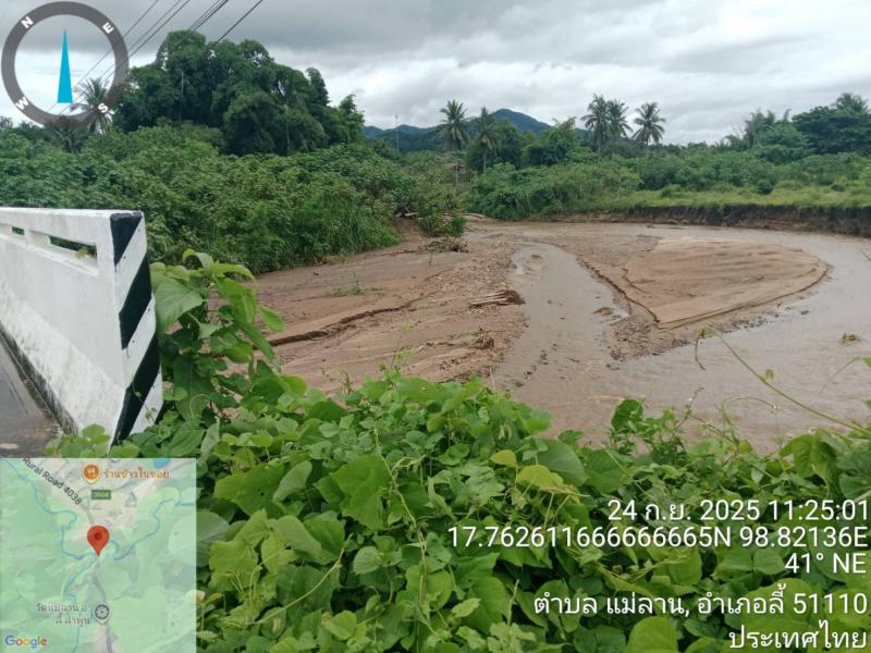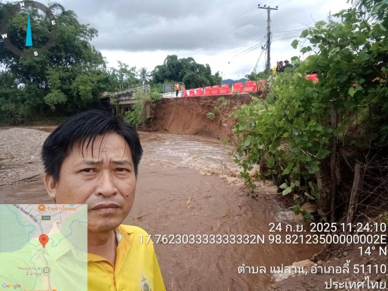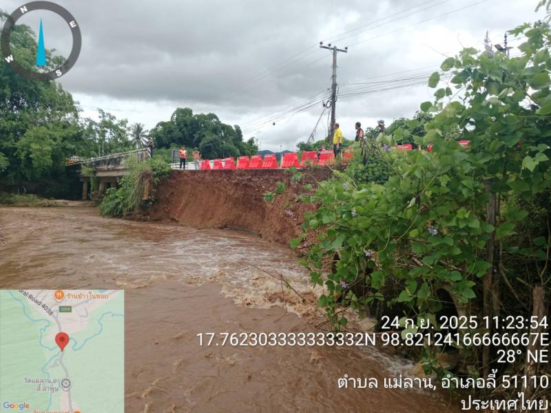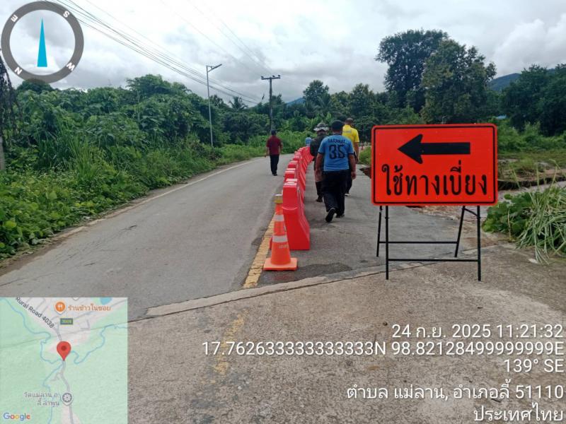 ลงพื้นที่สำรวจความเสียหายจากอุทกภัย บริเวณถนนทางหลวงชนบทสาย ลพ 4038 บริเวณสะพานข้ามห้วยแม่ลาน บ้านแม่ลาน หมู่ที่ 3 ถนนชำรุด 1 ช่องทางจราจร และบริเวณสะพานข้ามห้วยแม่หาด บ้านห้วยทรายขาว หมู่ที่ 7 ตำบลแม่ลาน อำเภอลี้ จังหวัดลำพูน เนื่องจากมีฝนตกหนัก น้ำป่าไหลหลากในพื้นที่ตำบลแม่ลาน เพื่อดำเนินการแก้ไขปัญหาเบื้องต้นในช่วงฤดูฝน