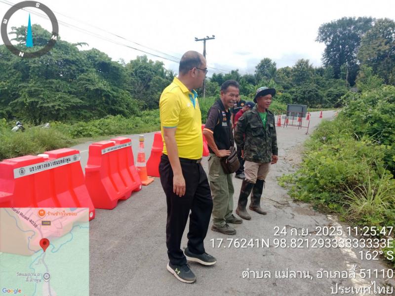รายละเอียด : วันที่ 24 กันยายน 2568 องค์การบริหารส่วนตำบลแม่ลาน โดย นายโสภณ มีมัง นายกองค์การบริหารส่วนตำบลแม่ลาน มอบหมายให้ นายสุริยา ปวรรณา เจ้าพนักงานป้องกันและสาธารณภัยฯองค์การบริหารส่วนตำบลแม่ลาน ร่วมกับ นายพลภัทร์ ประภัสระกูล ปลัดอำเภอลี้ พร้อมด้วย กำนันตำบลแม่ลาน ผู้ใหญ่บ้าน หมู่ที่ 3 และหมู่ที่ 7
