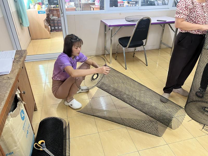 3.เมื่อยึดติดตามข้อ 2 เสร็จแล้วให้คว่ำเอาตะแกรงฝาปิดพัดลมไว้ด้านล่างและนำขอบพลาสติกที่ใช้ยึดตะแกรงฝาปิดพัดลมไว้ด้านล่างและนำขอบพลาสติกที่ใช้ยึดตะแกรงฝาปิดใบพัดลม มาสวมขอบตาข่ายพลาสติกด้านบนจัดให้พอดีขอบบน แล้วผูกติดด้ายสายรัดหรือเชือกหรือลวดให้รอบขอบ เมื่อผูกยึดรอบแล้ว ก็จะออกเป็นรูปทรงกระบอกสามารถตั้งได้
