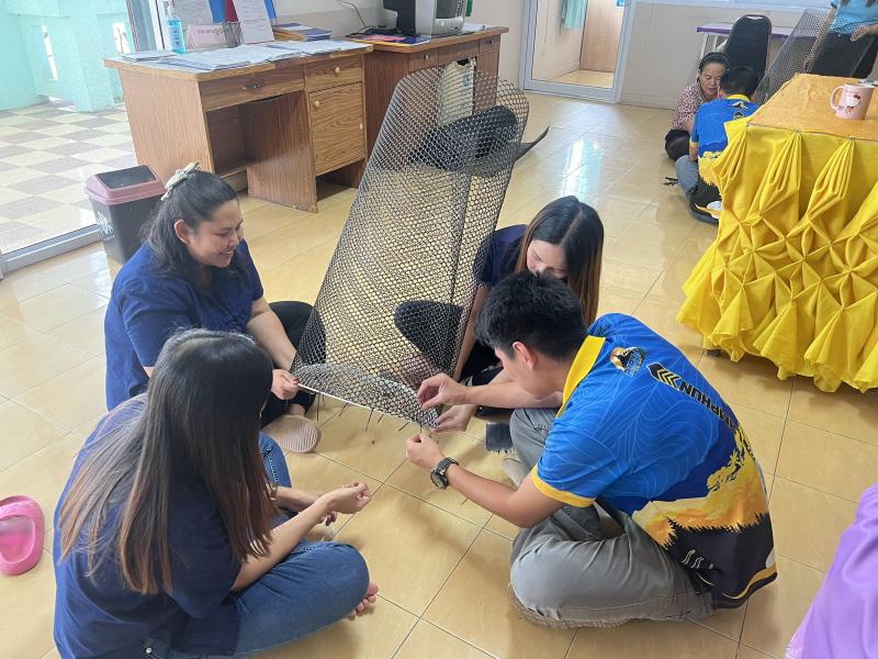 4.เมื่อทำเสร็จตามข้อ 3 แล้ว ให้เอาสายรัดหรือลวดผูกตาข่ายพลาสติกที่ปลายทั้งสองด้านซ้อนกันอยู่ให้แน่นตลอดแนวบน-ล่าง