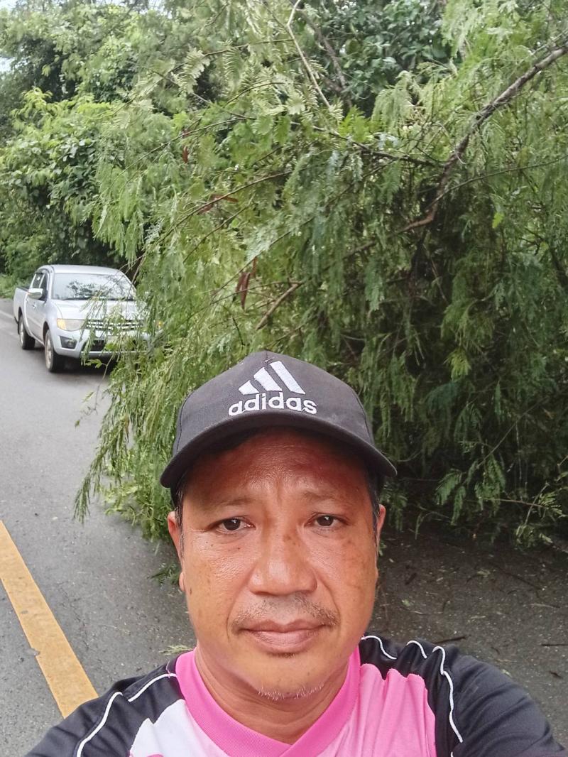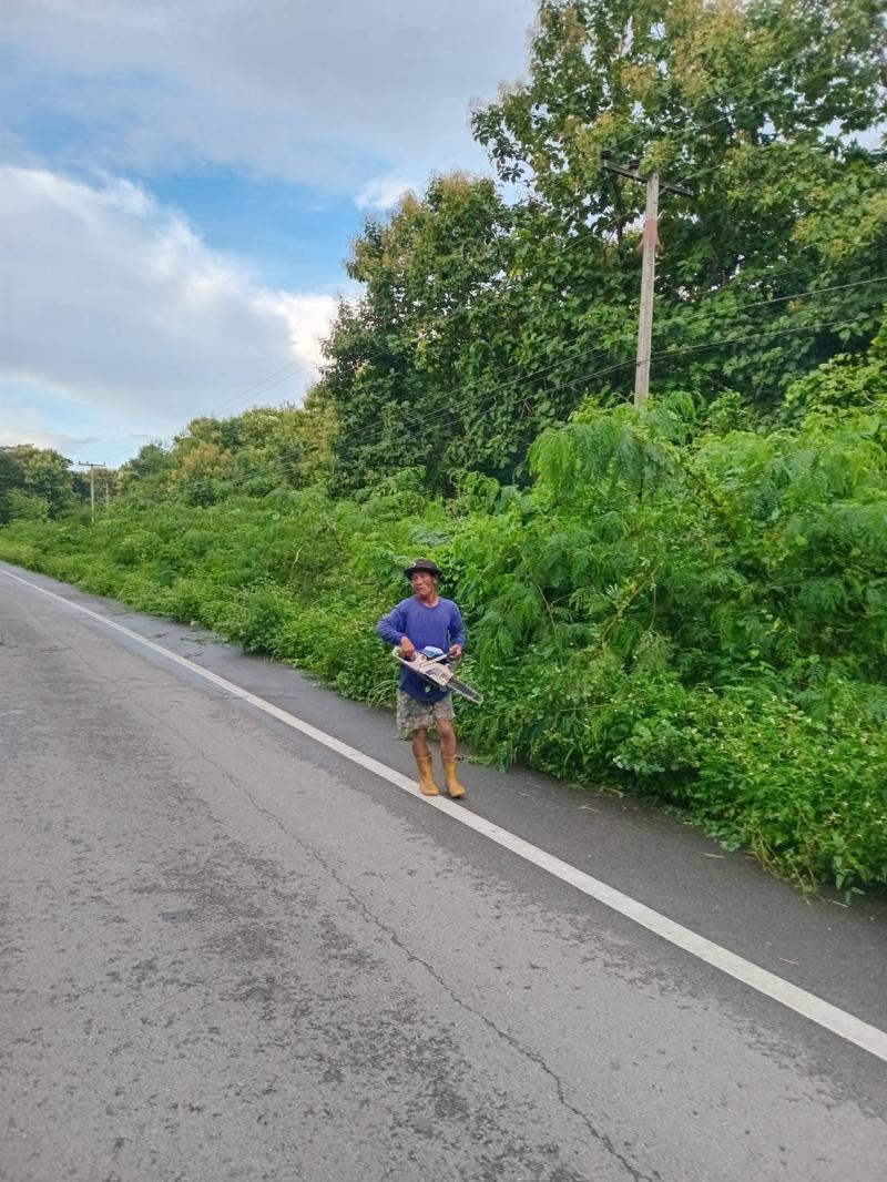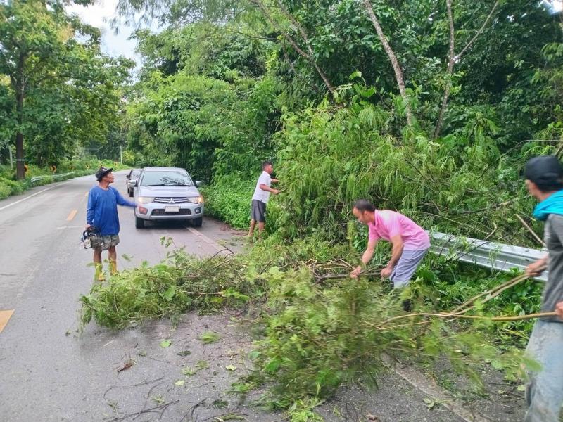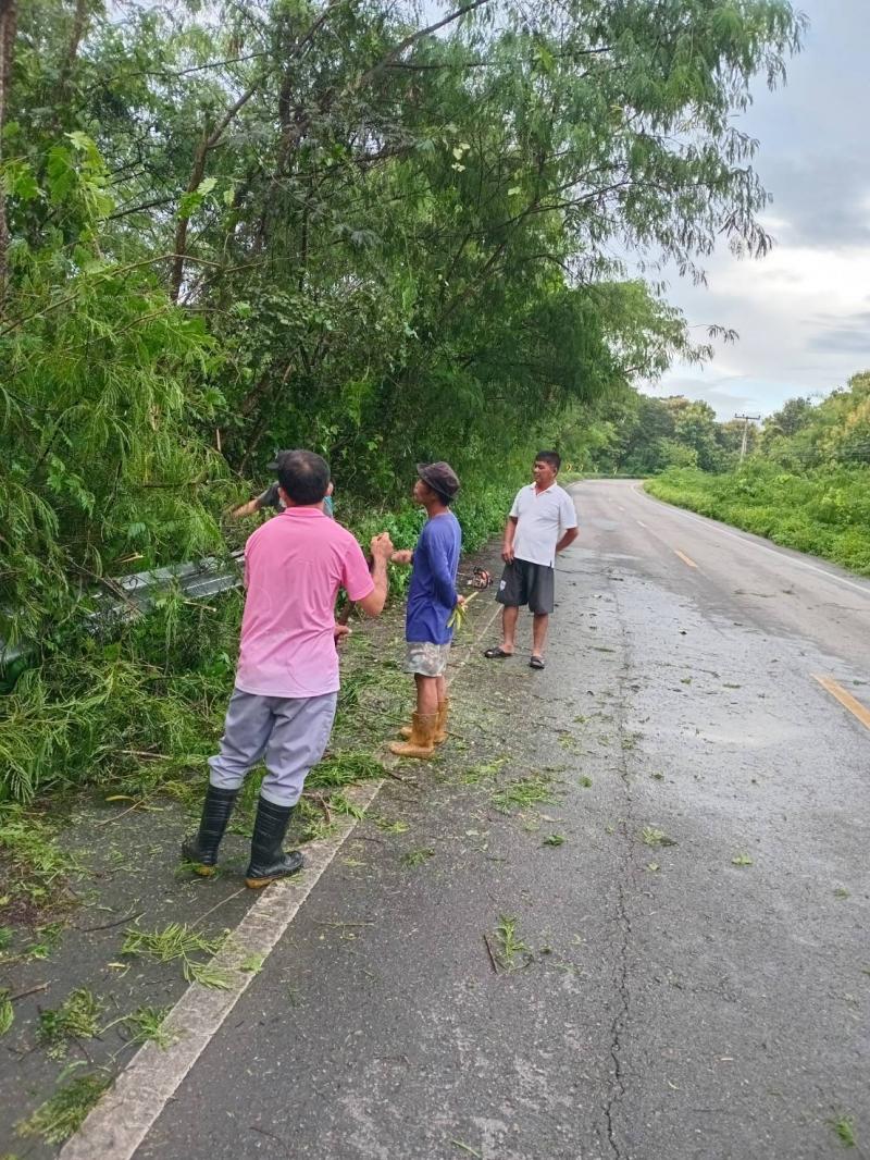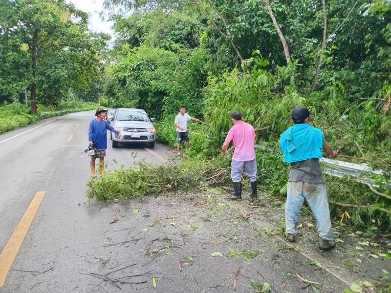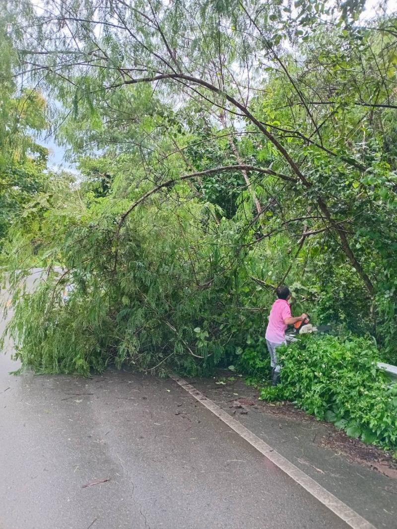 ดำเนินการตัดต้นไม้ที่ล้มทับกีดขวางทางจราจร บริเวณบ้านเด่นเหม้า หมู่ที่ 5 ตำบลแม่ลาน อำเภอลี้ จังหวัดลำพูน