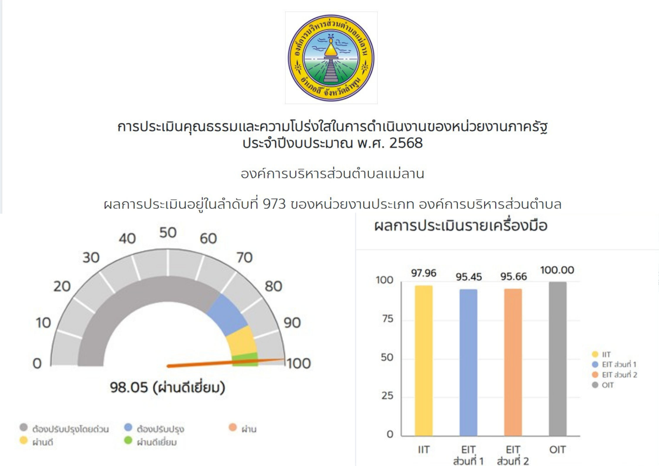 ????องค์การบริหารส่วนตำบลแม่ลาน ผ่านการประเมินคุณธรรมและความโปร่งใสในการดำเนินงานของหน่วยงานภาครัฐ (Integrity and Transparency Assessment : ITA) ประจำปี พ.ศ. 2568 โดยผลการประเมินอยู่ในระดับที่ 973 ของหน่วยงานประเภท องค์การบริหารส่วนตำบล ได้รับผลคะแนนเฉลี่ย 98.05 คะแนน อยู่ในระดับ ผ่านดีเยี่ยม✨???? ________________________________________ -เเหล่งข่าว : องค์การบริหารส่วนตำบลแม่ลาน -ประชาสัมพันธ์ข่าว : งานประชาสัมพันธ์ สำนักปลัดองค์การบริหารส่วนตำบลแม่ลาน -เว็บไซต์ : https://www.maelan.go.th -Facebook : https://www.facebook.com/saomaelan.maelan.7?mibextid=ZbWKwL -Youtube : https://youtube.com/@user-eq2cc4bc2f?si=EvKRe7B5IyUmlv8Z #องค์การบริหารส่วนตำบลแม่ลาน ???? 12/1 หมู่ 7 ตำบลแม่ลาน อำเภอลี้ จังหวัดลำพูน ????โทรศัพท์ สำนักงาน : 096-6858480 ????อุบัติเหตุ โทร 1669 ฟรี /สายตรงรถฉุกเฉินองค์การบริหารส่วนตำบลแม่ลาน : 081-4736884