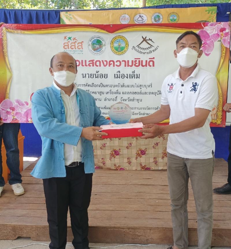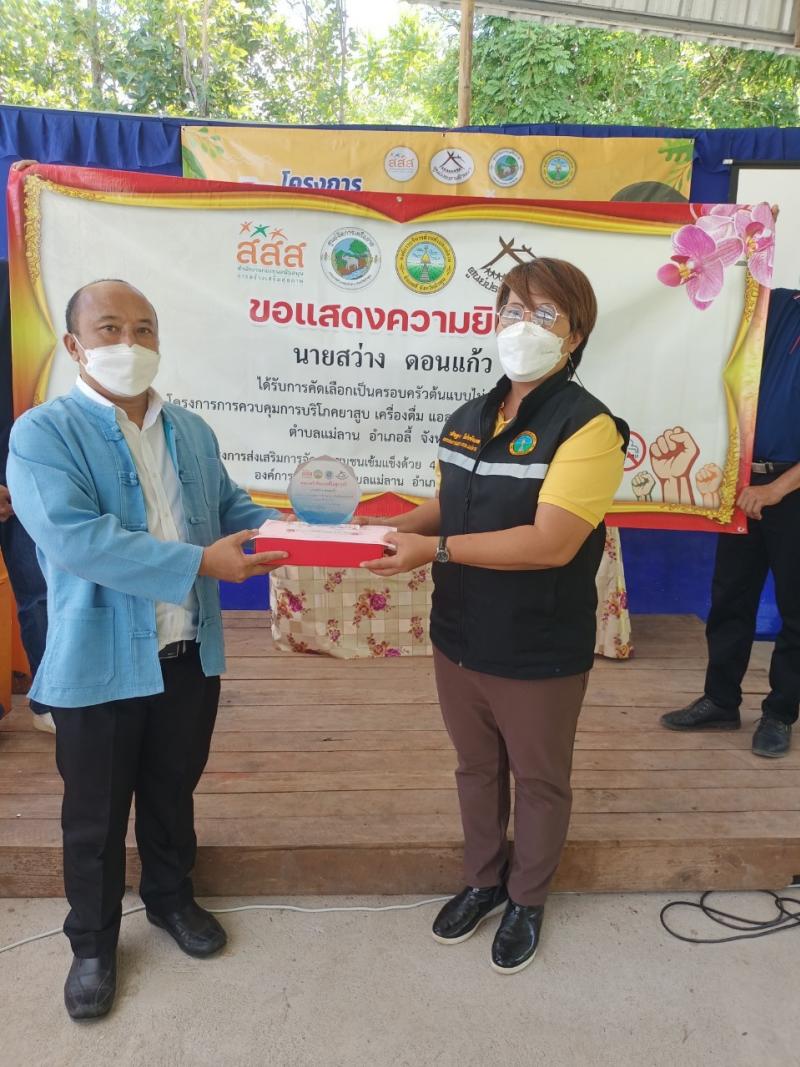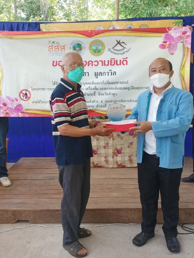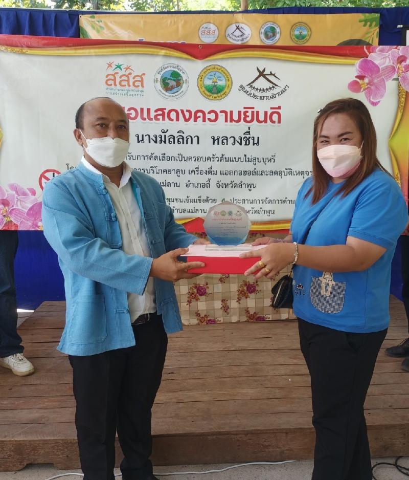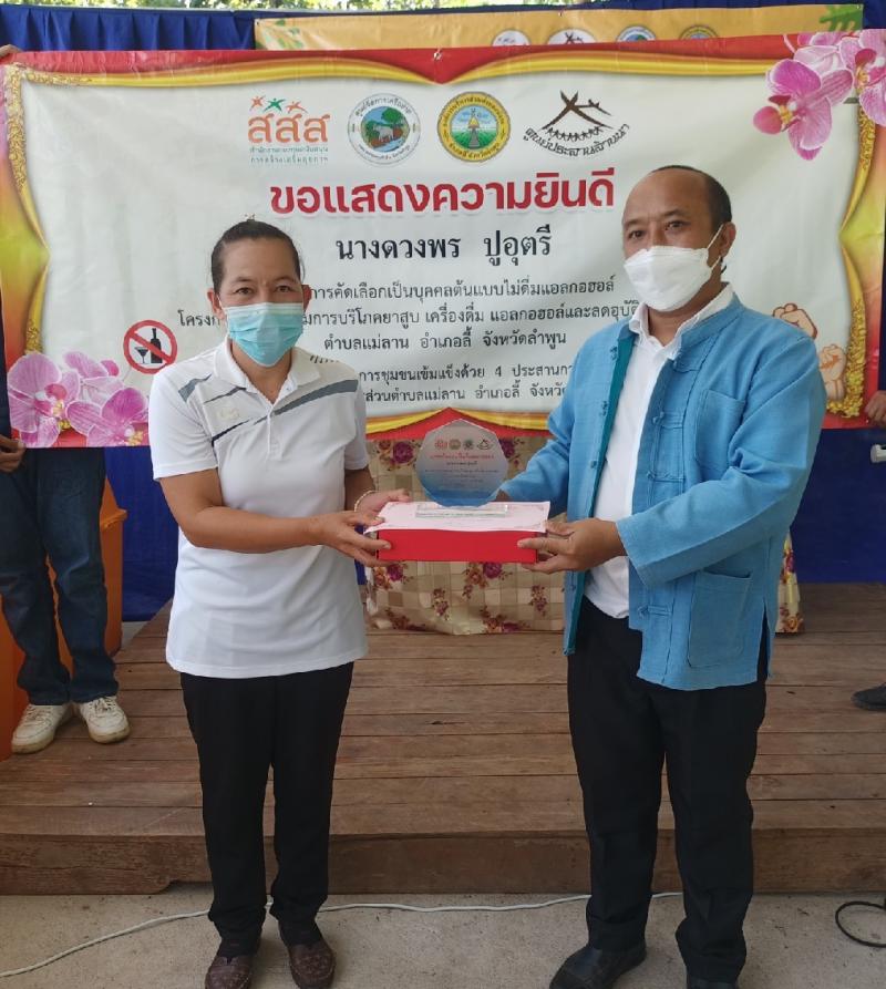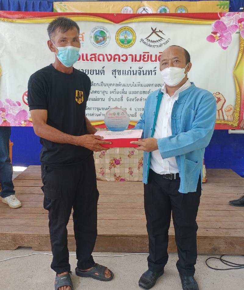 รายละเอียด : วันที่ 27 กรกฎาคม พ.ศ. 2565 นายโสภณ มีมัง นายกองค์การบริหารส่วนตำบลแม่ลาน เป็นตัวแทนมอบโล้และเกียรติบัตรแก่บุคคลต้นแบบ "ไม่ดื่มแอลกอฮอล์และไม่สูบบุหรี่" ตามโครงการการควบคุมการบริโภคยาสูบ เครื่องดื่มแฮลกอฮอล์ และลดอุบัติเหตุจราจร ตำบลแม่ลาน อำเภอลี้ จังหวัดลำพูน ภายใต้โครงการส่งเสริมการจัดการชุมชนเข้มแข็ง ด้วย 4 ประสาน การจัดการตำบลสุขภาวะ องค์การบริหารส่วนตำบลแม่ลาน อำเภอลี้ จังหวัดลำพูน ณ โรงจอดรถองค์การบริหารส่วนตำบลแม่ลาน