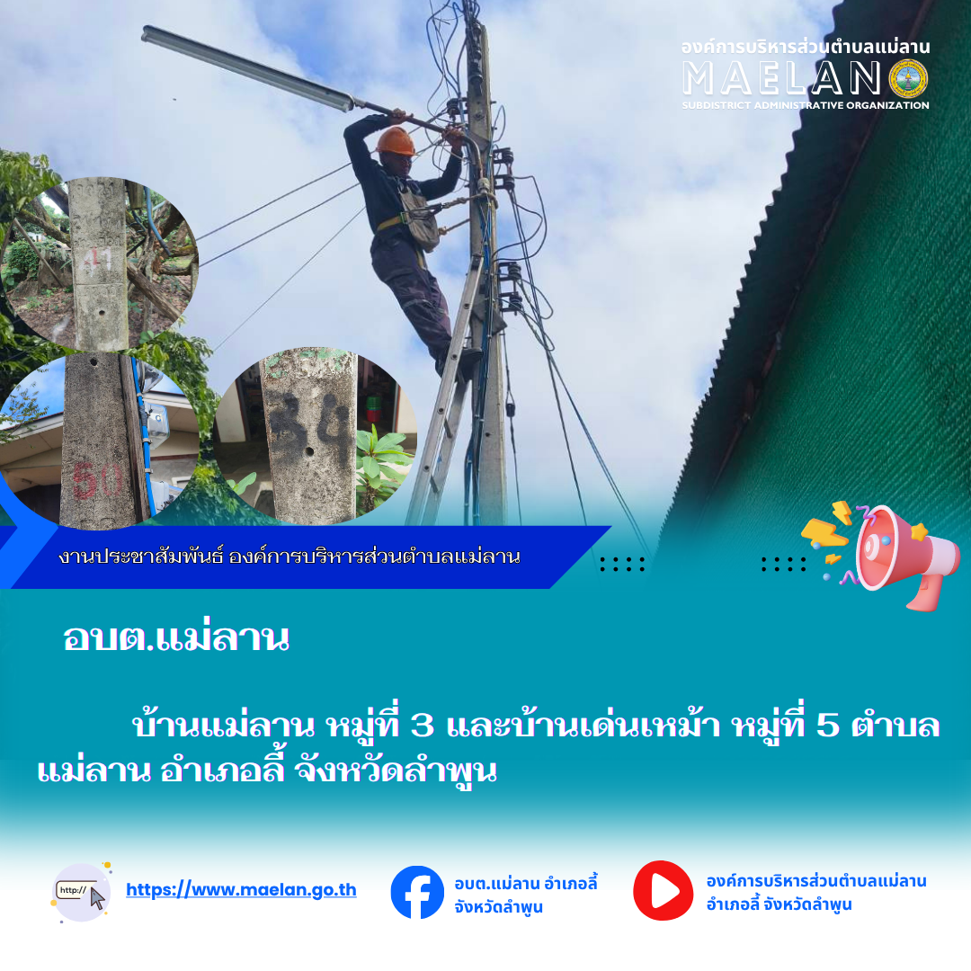 วันที่ 12 พฤศจิกายน 2568 องค์การบริหารส่วนตำบลแม่ลาน โดย นายโสภณ มีมัง นายกองค์การบริหารส่วนตำบลแม่ลาน มอบหมายให้เจ้าหน้าที่กองช่างองค์การบริหารส่วนตำบลแม่ลาน ลงพื้นที่ทำการซ่อมแซมไฟกิ่งสาธารณะ ... [13 พฤศจิกายน 2568]