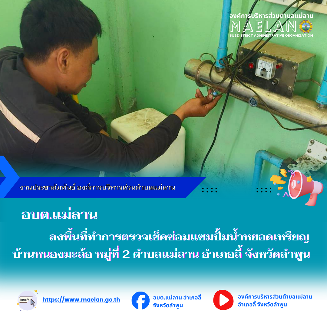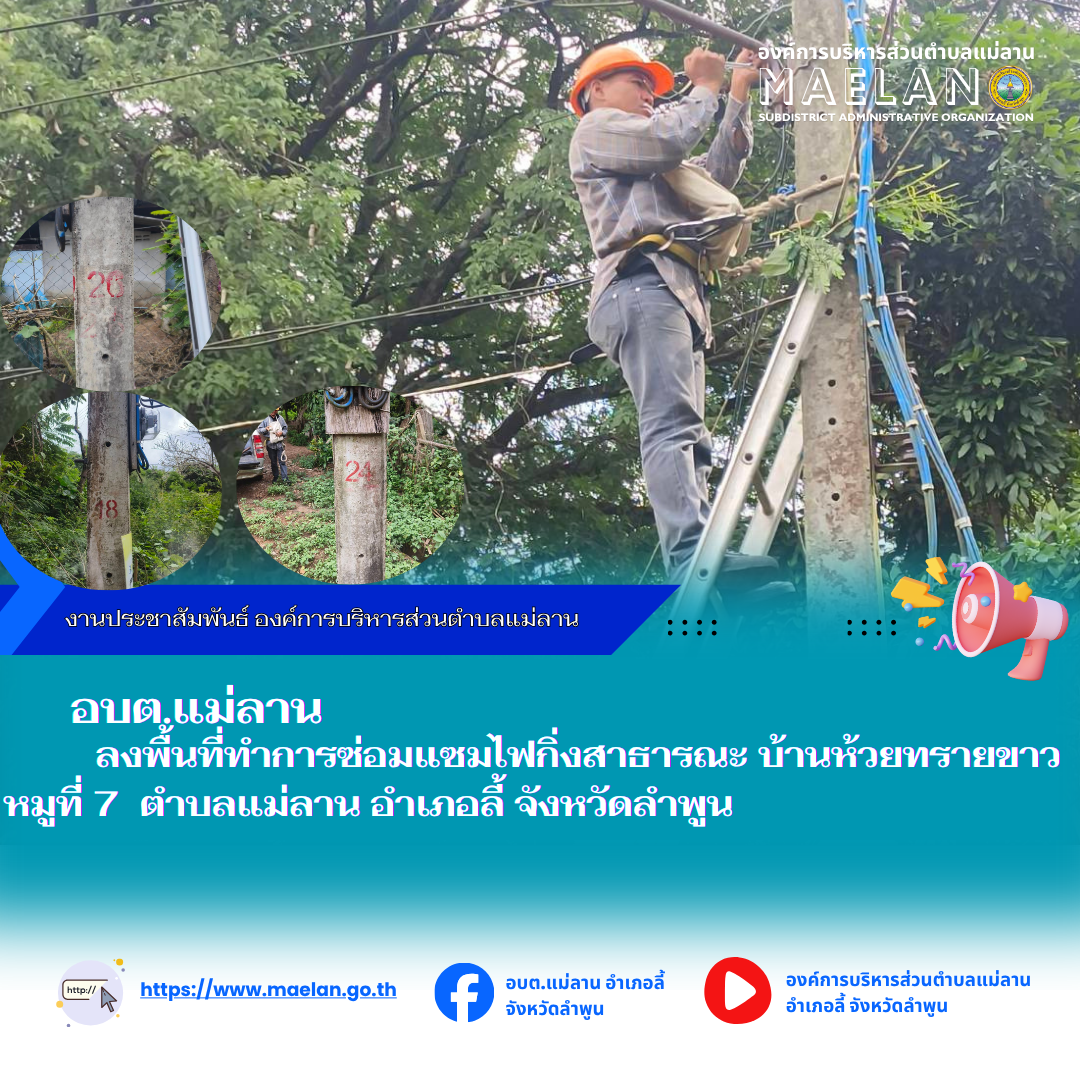 วันที่ 13 พฤศจิกายน 2568 องค์การบริหารส่วนตำบลแม่ลาน โดย นายโสภณ มีมัง นายกองค์การบริหารส่วนตำบลแม่ลาน มอบหมายให้เจ้าหน้าที่กองช่างองค์การบริหารส่วนตำบลแม่ลาน ลงพื้นที่ทำการซ่อมแซมไฟกิ่งสาธารณะ บ้านแม่ลาน... [13 พฤศจิกายน 2568]