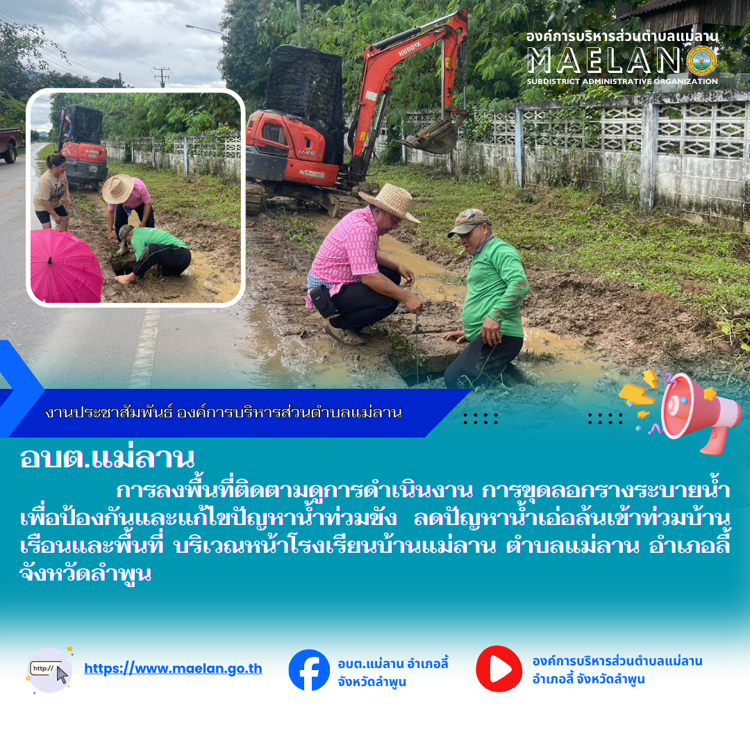 วันที่ 24 กันยายน 2568 องค์การบริหารส่วนตำบลแม่ลาน นำโดย นายโสภณ มีมัง นายกองค์การบริหารส่วนตำบลแม่ลาน การลงพื้นที่ติดตามดูการดำเนินงาน การขุดลอกรางระบายน้ำ เพื่อป้องกันและแก้ไขปัญหาน้ำท่วมขัง... [24 กันยายน 2568]