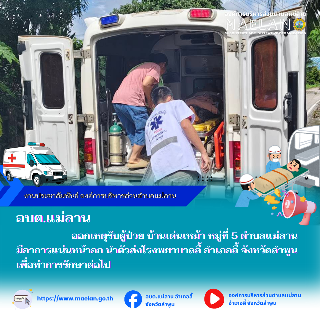 วันที่ 24 กันยายน 2568 องค์การบริหารส่วนตำบลแม่ลาน โดย นายโสภณ มีมัง นายกองค์การบริหารส่วนตำบลแม่ลาน มอบหมายให้เจ้าหน้าที่กู้ชีพองค์การบริหารส่วนตำบลแม่ลาน ออกเหตุรับผู้ป่วย บ้านเด่นเหม้า หมู่ที่ 5... [25 กันยายน 2568]
