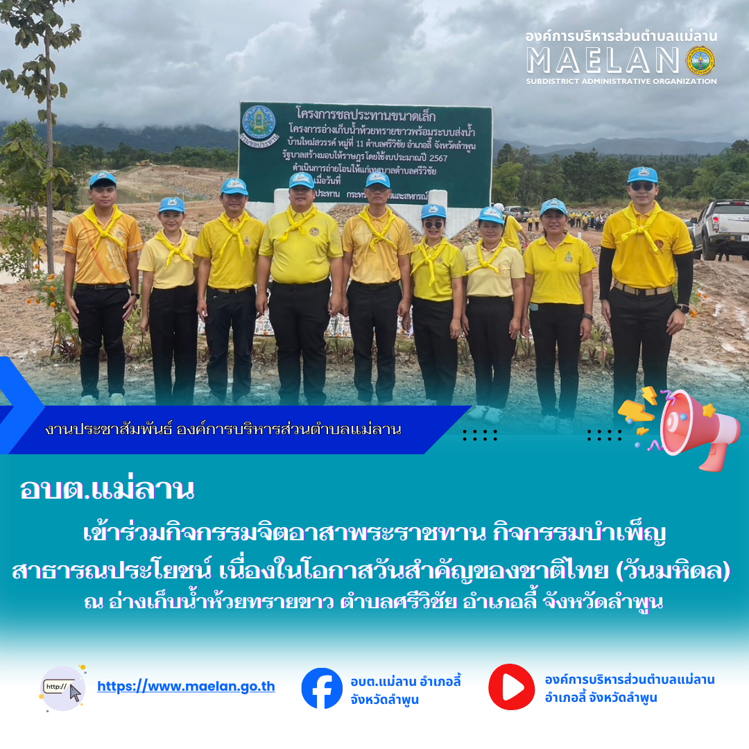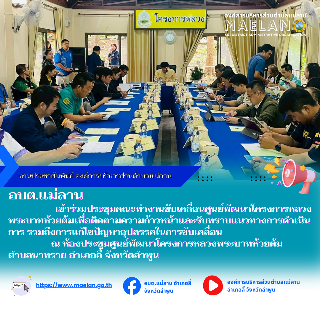 วันที่ 24 กันยายน 2568 เวลา 09.00 น. องค์การบริหารส่วนตำบลแม่ลาน นำโดย นายโสภณ มีมัง นายกองค์การบริหารส่วนตำบลแม่ลาน เข้าร่วมประชุมคณะทำงานขับเคลื่อนศูนย์พัฒนาโครงการหลวงพระบาทห้วยต้ม... [24 กันยายน 2568]