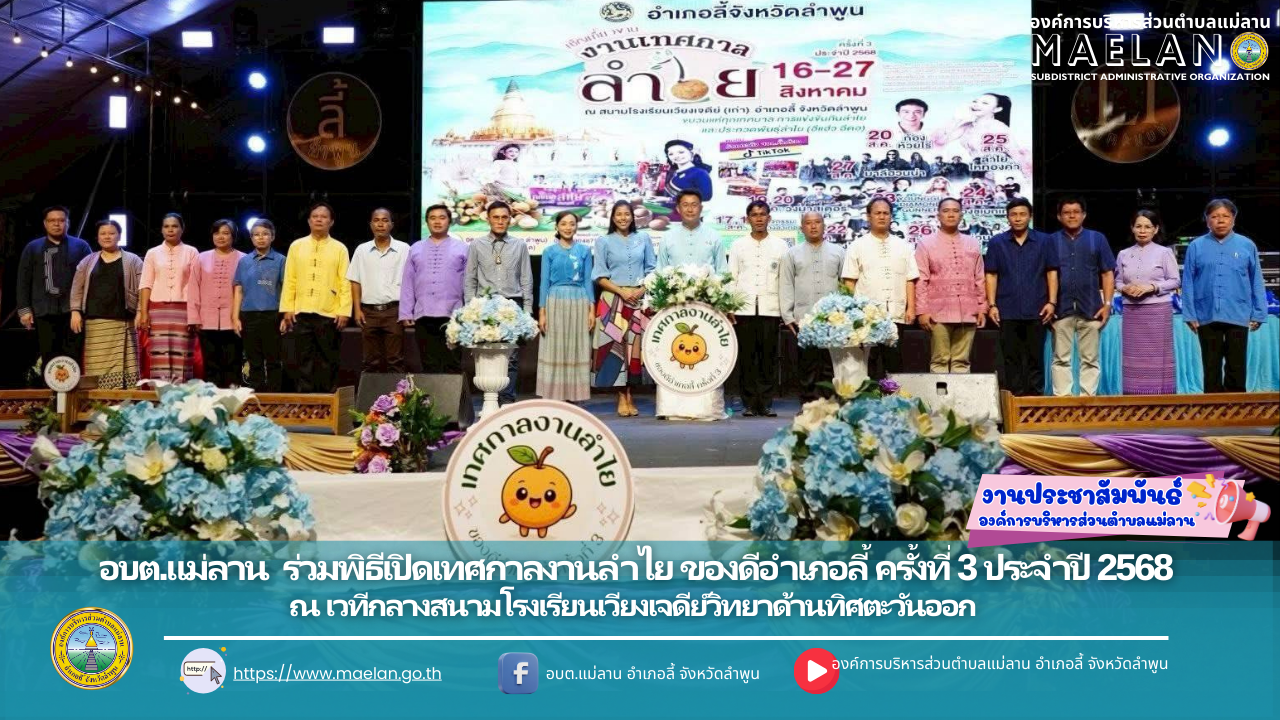 วันที่ 16 สิงหาคม 2568 องค์การบริหารส่วนตำบลแม่ลาน นำโดย นายโสภณ มีมัง นายกองค์การบริหารส่วนตำบลแม่ลาน พร้อมด้วยคณะผู้บริหาร หัวหน้าส่วนราชการ ร่วมพิธีเปิดเทศกาลงานลำไย ของดีอำเภอลี้ ครั้งที่ 3 ประจำปี 2568 ... [16 สิงหาคม 2568]