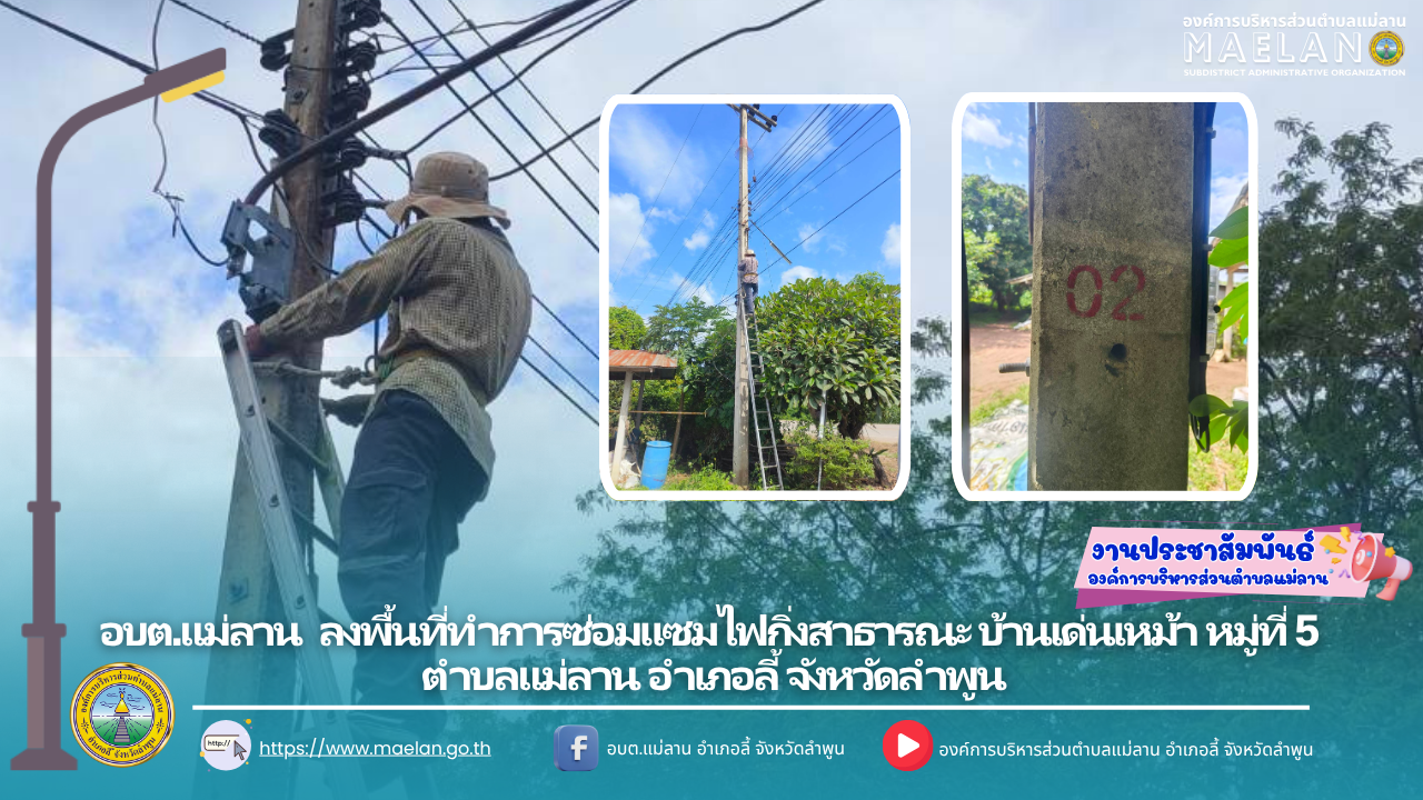 วันที่ 1 สิงหาคม 2568 องค์การบริหารส่วนตำบลแม่ลาน โดย นายโสภณ มีมัง นายกองค์การบริหารส่วนตำบลแม่ลาน มอบหมายให้เจ้าหน้าที่กองช่างองค์การบริหารส่วนตำบลแม่ลาน ลงพื้นที่ทำการซ่อมแซมไฟกิ่งสาธารณะ บ้านเด่นเหม้า... [1 สิงหาคม 2568]