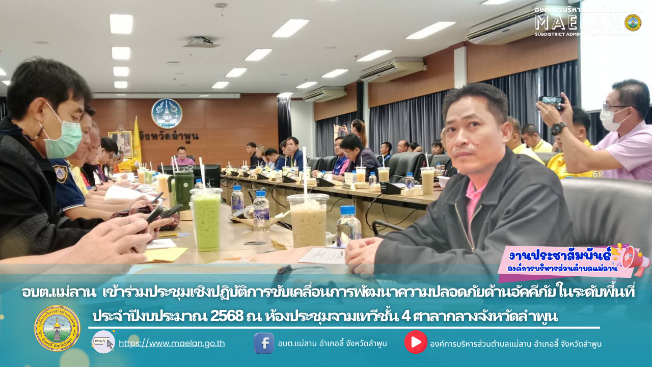 วันที่ 22 กรกฎาคม 2568 เวลา 09.00 น. องค์การบริหารส่วนตำบลแม่ลาน โดย นายโสภณ มีมัง นายกองค์การบริหารส่วนตำบลแม่ลาน มอบหมายให้ นายสุริยา ปวรรณา เจ้าพนักงานป้องกันและสาธารณภัย องค์การบริหารส่วนตำบลแม่ลาน ... [22 กรกฎาคม 2568]