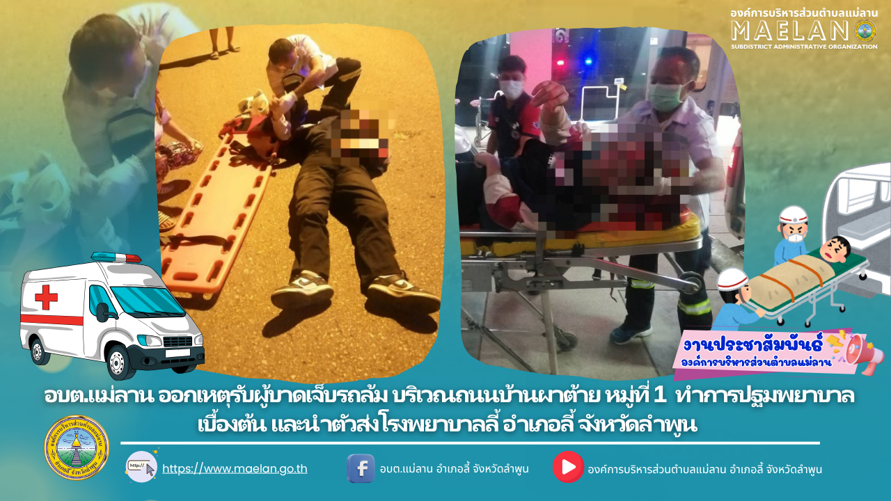 วันที่ 22 กรกฎาคม 2568 องค์การบริหารส่วนตำบลแม่ลาน โดย นายโสภณ มีมัง นายกองค์การบริหารส่วนตำบลแม่ลาน มอบหมายให้เจ้าหน้าที่กู้ชีพองค์การบริหารส่วนตำบลแม่ลาน ออกเหตุรับผู้บาดเจ็บรถล้มบริเวณถนนบ้านผาต้าย... [22 กรกฎาคม 2568]
