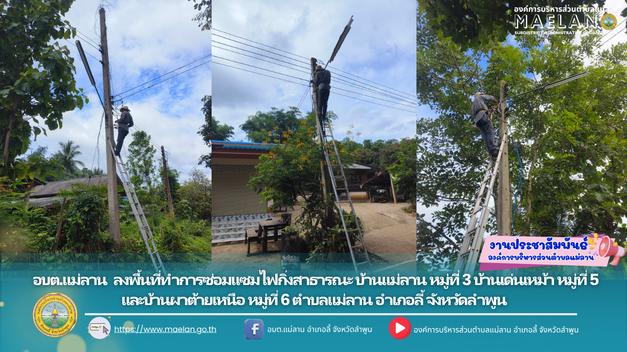วันที่ 21 กรกฎาคม 2568 องค์การบริหารส่วนตำบลแม่ลาน โดย นายโสภณ มีมัง นายกองค์การบริหารส่วนตำบลแม่ลาน มอบหมายให้เจ้าหน้าที่กองช่างองค์การบริหารส่วนตำบลแม่ลาน ลงพื้นที่ทำการซ่อมแซมไฟกิ่งสาธารณะ บ้านแม่ลาน... [21 กรกฎาคม 2568]
