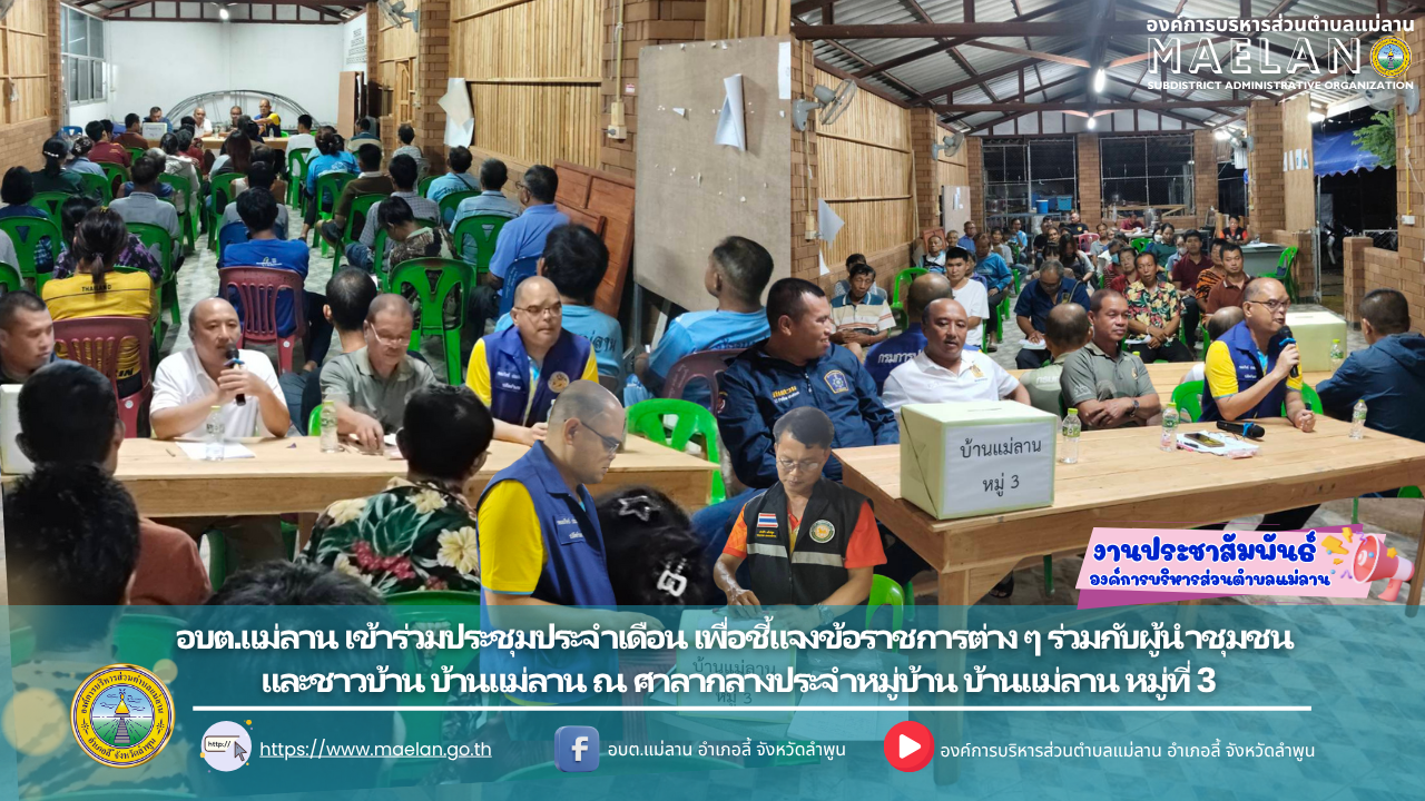 วันที่ 16 กรกฎาคม 2568 องค์การบริหารส่วนตำบลแม่ลาน นำโดย นายโสภณ มีมัง นายกองค์การบริหารส่วนตำบลแม่ลาน พร้อมด้วยคณะผู้บริหาร สมาชิกสภาองค์การบริหารส่วนตำบลแม่ลาน บ้านแม่ลาน หมู่ที่ 3 เข้าร่วมประชุมประจำเดือน... [16 กรกฎาคม 2568]