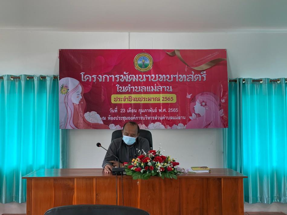 วันที่ 23 กุมภาพันธ์ 2565 เวลา 09.00 น. องค์การบริหารส่วนตำบลแม่ลาน ได้จัดประชุมโครงการพัฒนาบทบาทสตรีในตำบลแม่ลาน ประจำปีงบประมาณ 2565 โดย นายโสภณ มีมัง นายกองค์การบริหารส่วนตำบลแม่ลาน เป็นประธานเปิดโครงการดังกล่าว... [23 กุมภาพันธ์ 2565]