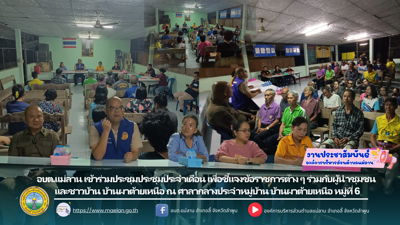 วันที่ 14 กรกฎาคม 2568 เวลา 15.00 น. องค์การบริหารส่วนตำบลแม่ลาน นำโดย นายโสภณ มีมัง นายกองค์การบริหารส่วนตำบลแม่ลาน พร้อมด้วย นายสมพงษ์ ด้วงประสิทธิ์ ปลัดองค์การบริหารส่วนตำบลแม่ลาน และ นายประวิทย์ ล่าเพ็ง... [14 กรกฎาคม 2568]