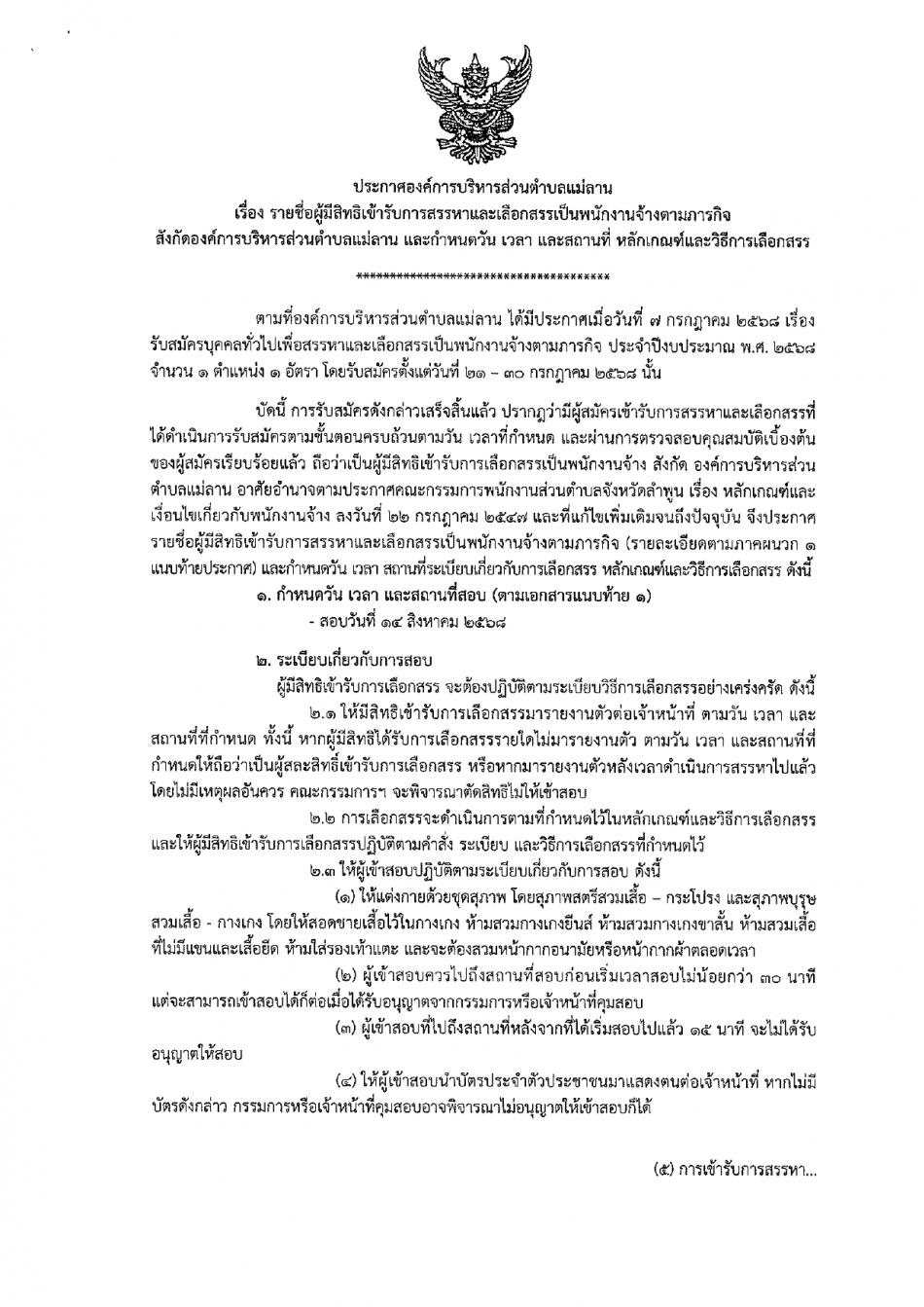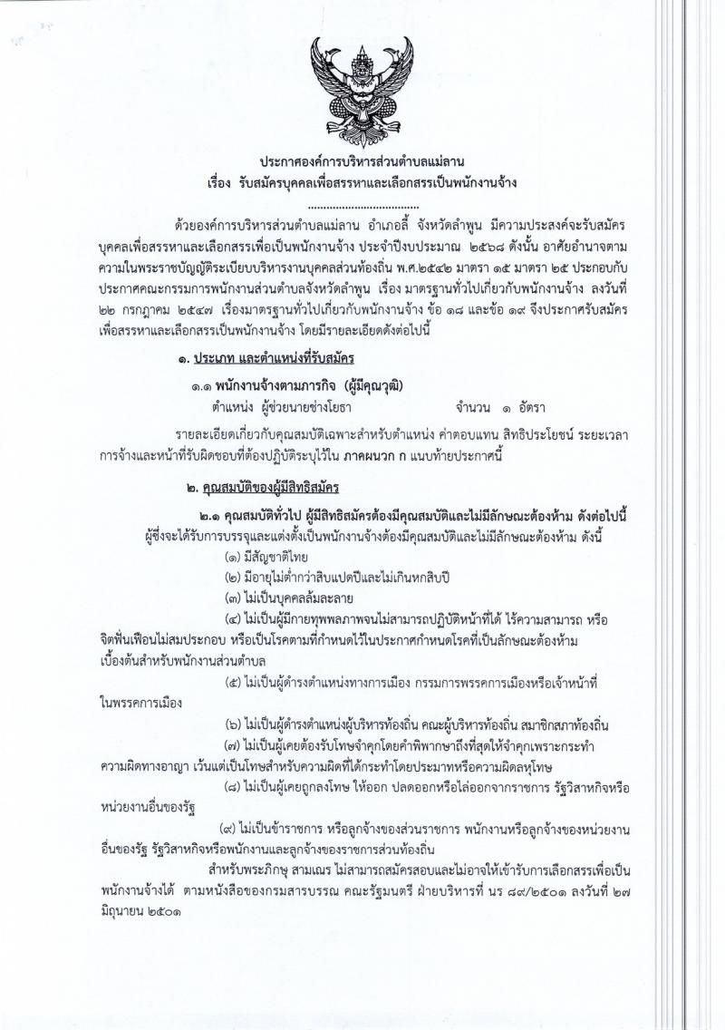 ประกาศองค์การบริหารส่วนตำบลแม่ลานรับสมัครบุคคลเพื่อสรรหาและเลือกสรรเป็นพนักงานจ้างตามภารกิจ ประจำปีงบประมาณ พ.ศ. 2568 ตำแหน่ง ผู้ช่วยนายช่างโยธา จำนวน 1 อัตรา [7 กรกฎาคม 2568]