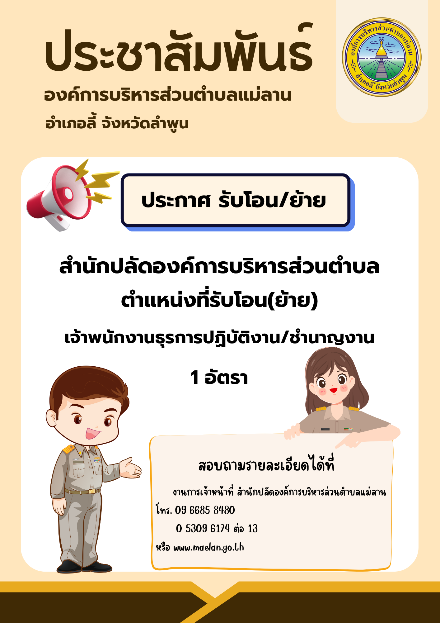 ประชาสัมพันธ์รับโอน(ย้าย)พนักงานส่วนตำบล/พนักงานส่วนตำบล/พนักงานส่วนท้องถิ่นอื่น หรือข้าราชการประเภทอื่น สายงานผู้ปฏิบัติ เพื่อแต่งตั้งให้ดำรงตำแหน่งที่ว่าง [31 กรกฎาคม 2568]