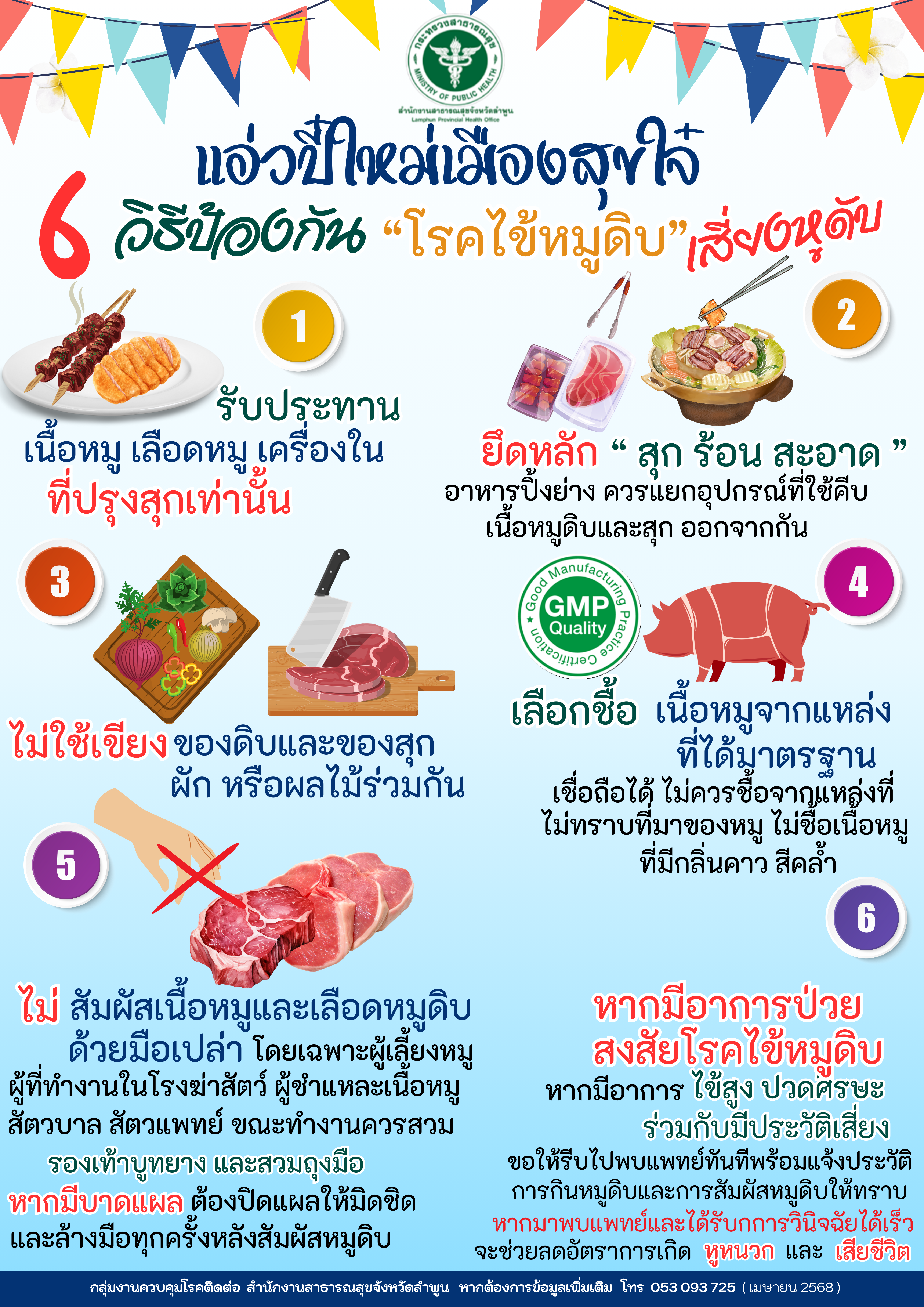#ประชาสัมพันธ์องค์การบริหารส่วนตำบลแม่ลาน #งานสาธารณสุของค์การบริหารส่วนตำบลแม่ลาน ????ขออนุญาตประชาสัมพันธ์สื่อ #แอ่วปี๋ใหม่เมืองสุขใจ๋ 6 วิธีป้องกัน โรคไข้หมูดิบ เสี่ยงหูดับ และ #ปี๋ใหม่เมือง กิ๋นหมูดิบ... [11 เมษายน 2568]