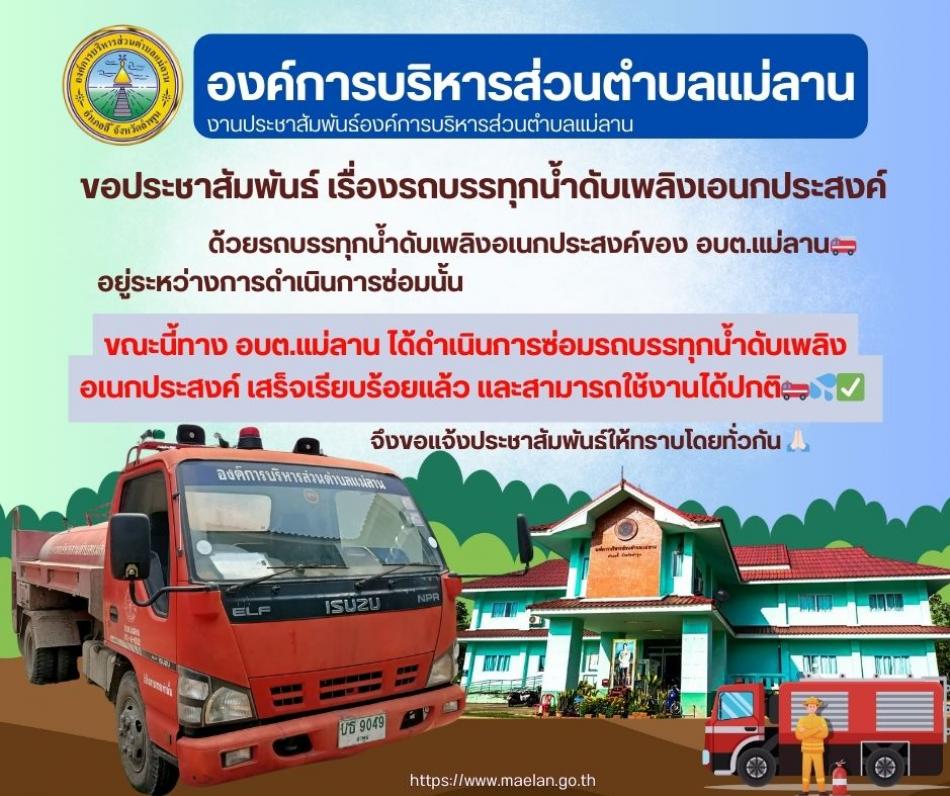 ???? แจ้งประชาสัมพันธ์ ???? ประชาสัมพันธ์จากงานป้องกันและบรรเทาสาธารณภัย องค์การบริหารส่วนตำบลแม่ลาน ด้วยรถบรรทุกน้ำดับเพลิงอเนกประสงค์ของ อบต.แม่ลาน???? อยู่ระหว่างการดำเนินการซ่อมนั้น ขณะนี้ทาง... [19 มีนาคม 2568]