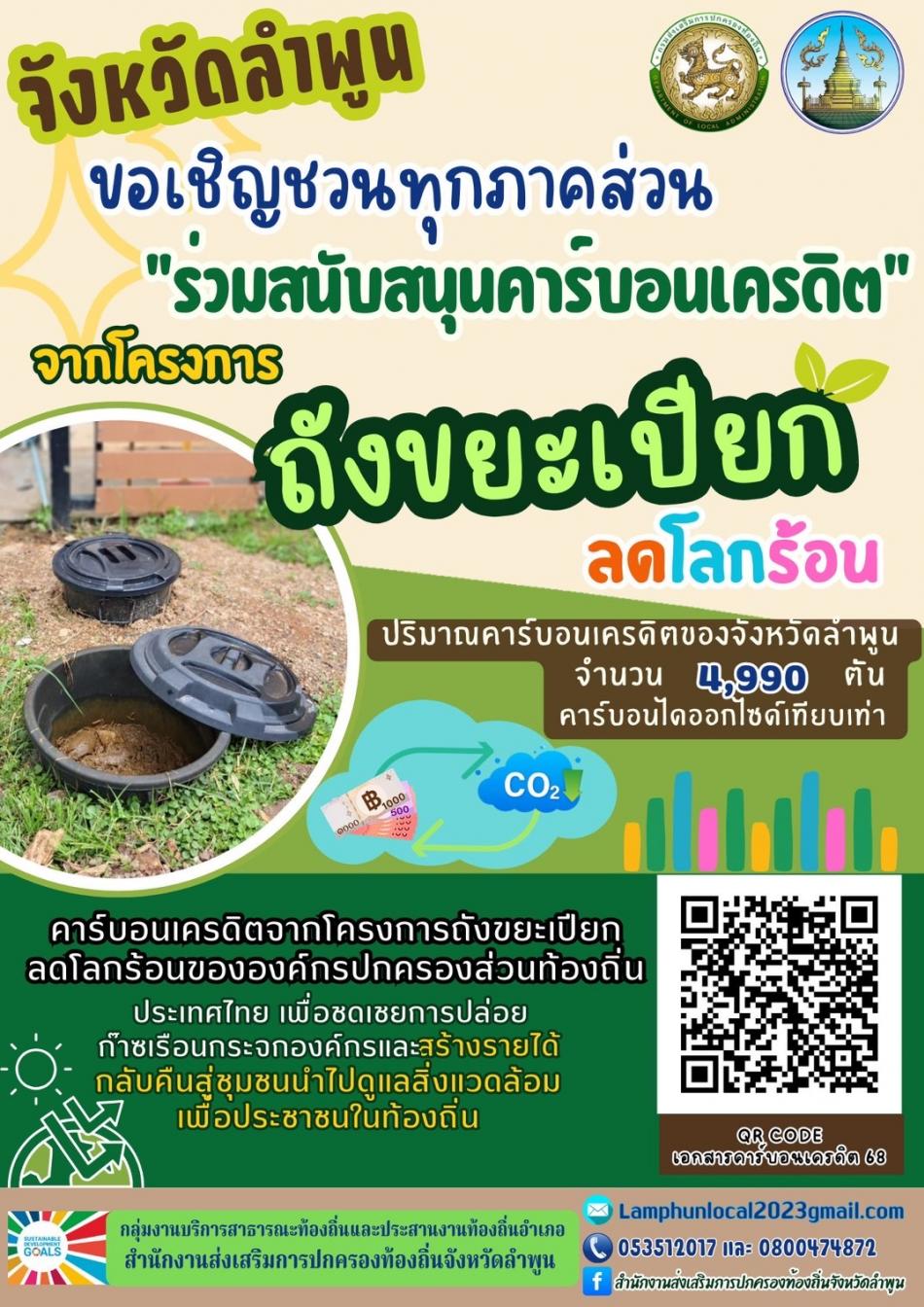 จังหวัดลำพูน ขอเชิญชวนทุกภาคส่วน "ร่วมสนับสนุนคาร์บอนเครดิต" จากโครงการถังขยะเปียกลดโลกร้อน [26 กุมภาพันธ์ 2568]