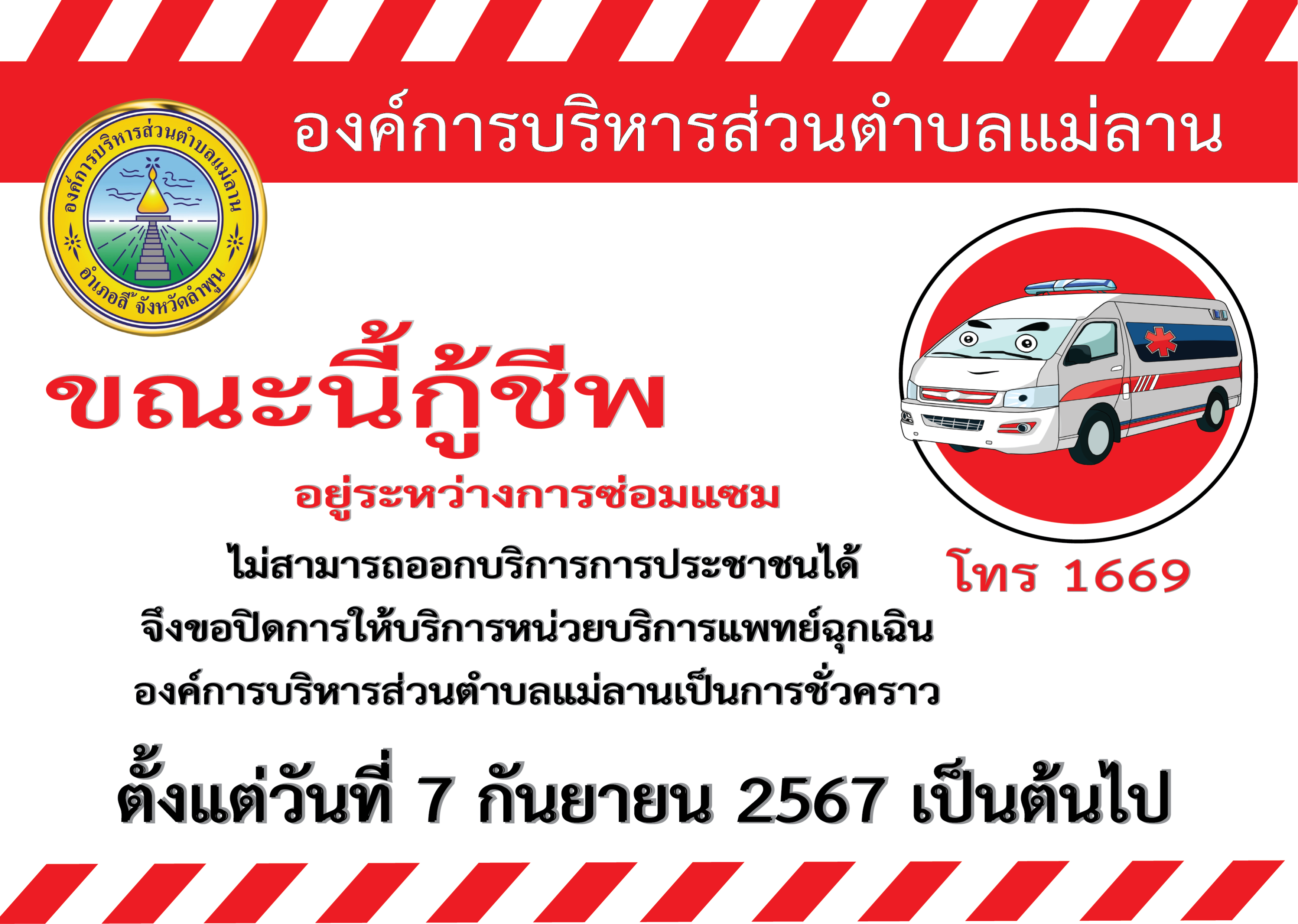 #แจ้งข่าว ???? #ประชาสัมพันธ์องค์การบริหารส่วนตำบลแม่ลาน #งานกู้ชีพองค์การบริหารส่วนตำบลแม่ลาน ???? กลับมาให้บริการพี่น้องประชาชนในเขตพื้นที่ตำบลแม่ลานได้ตามปกติแล้ว ตลอด 24 ชั่วโมง หากมีอาการเจ็บป่วยฉุกเฉิน... [15 มีนาคม 2568]