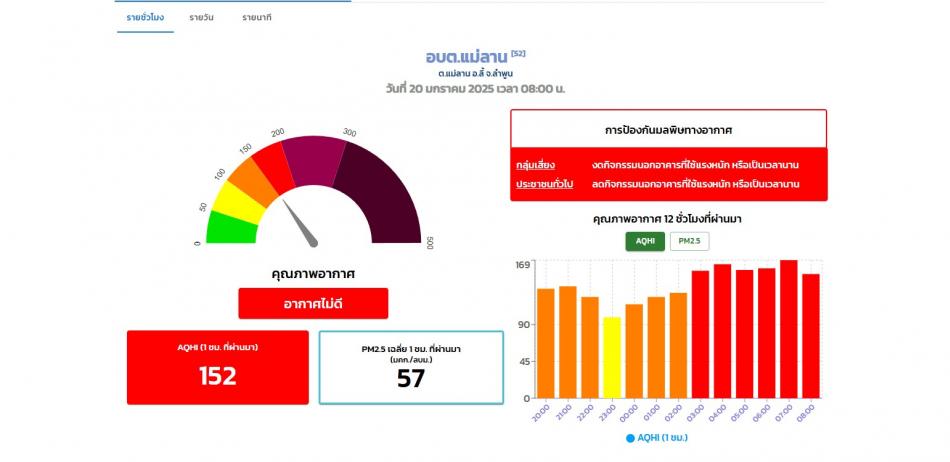 องค์การบริหารส่วนตำบลแม่ลาน : วันที่ 20/01/2025 เวลา 08:30 น. ค่า PM2.5 เฉลี่ยรายชั่วโมงของจุดตรวจวัดนี้ (07.00-08.00น.) เท่ากับ 57 มคก./ลบ.มม. ซึ่งเป็นระดับที่อาจจะเป็นอันตรายต่อสุขภาพ #เตือนประชาชน ???????? - ประชาชนในกลุ่มเสี่ยง... [20 มกราคม 2568]