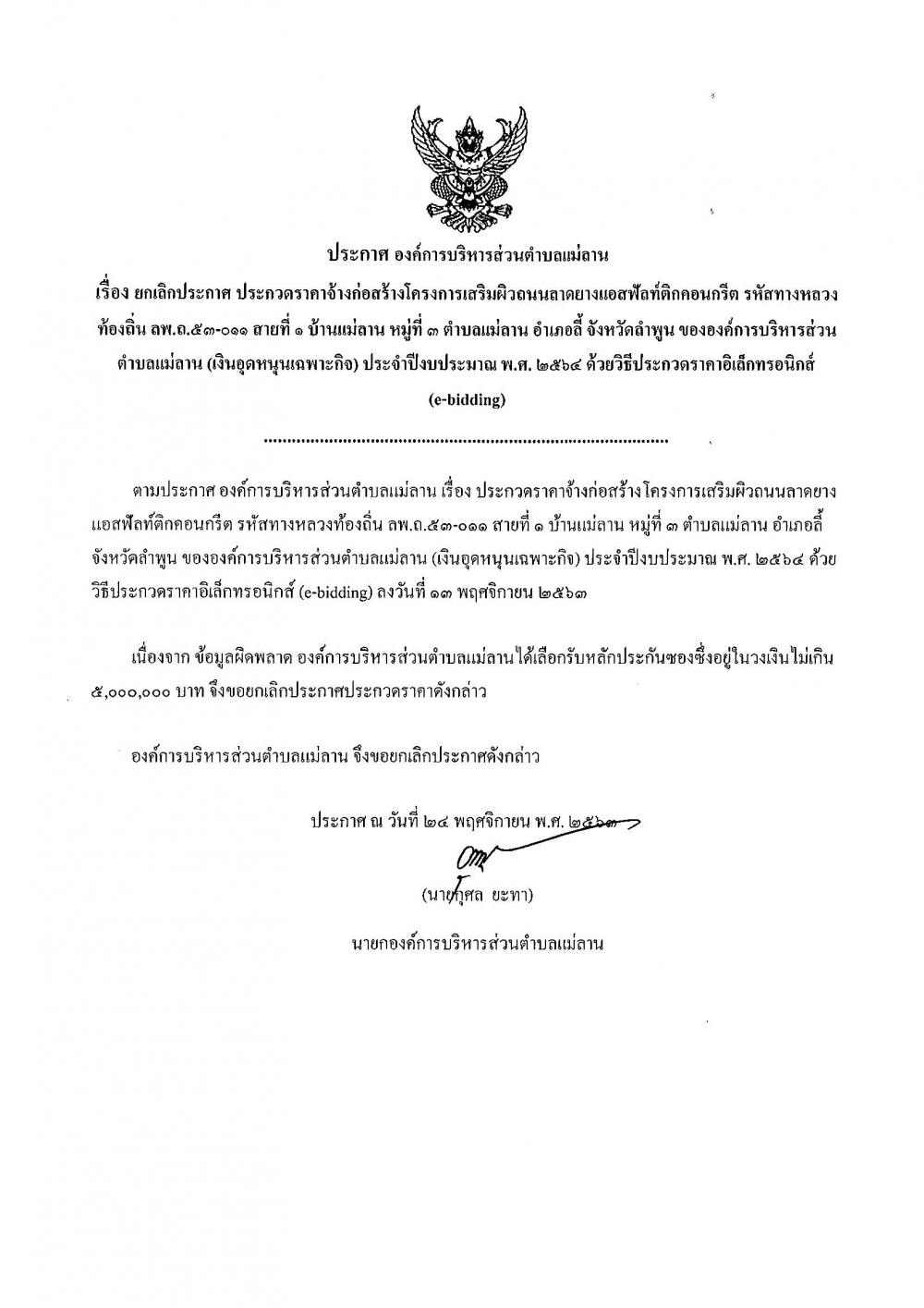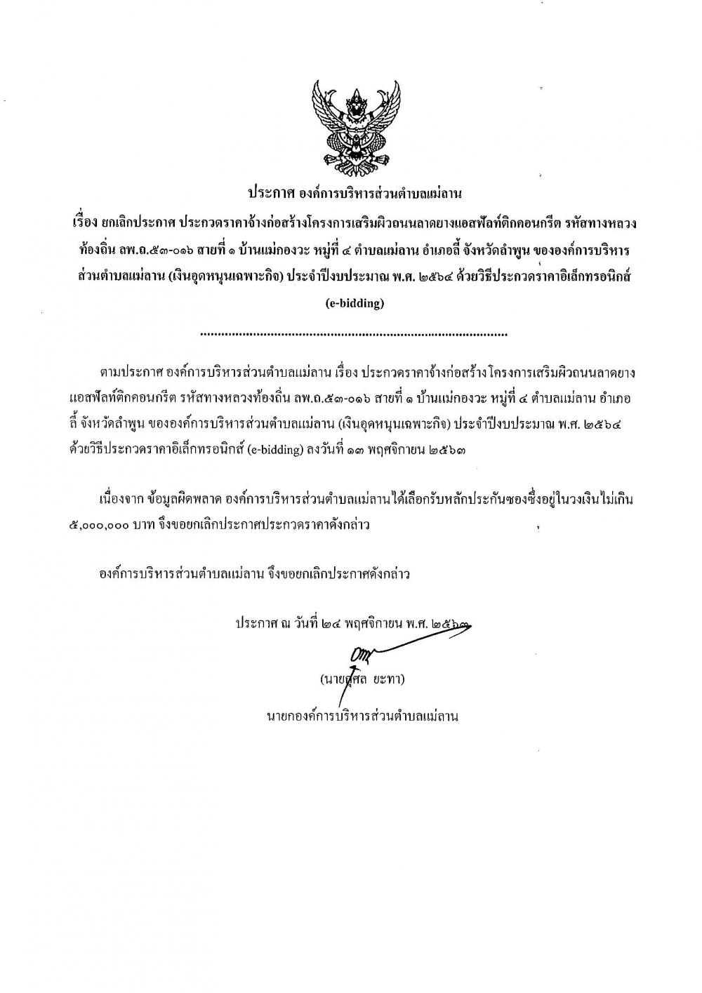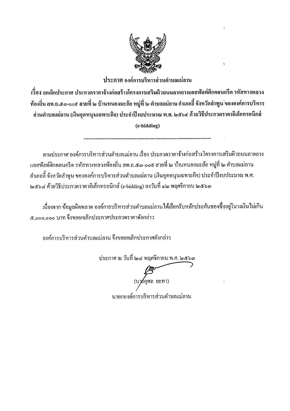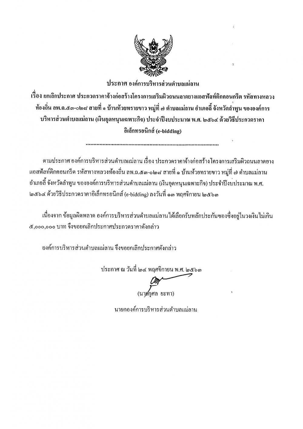 เกินกว่า 5,000,000 บาท ซึ่งทางองค์การบริหารส่วนตำบลแม่ลานได้เลือกกำหนดรับหลักประกันการเสนอราคา จึงขอยกเลิกประกาศประกวดราคาดังกล่าว