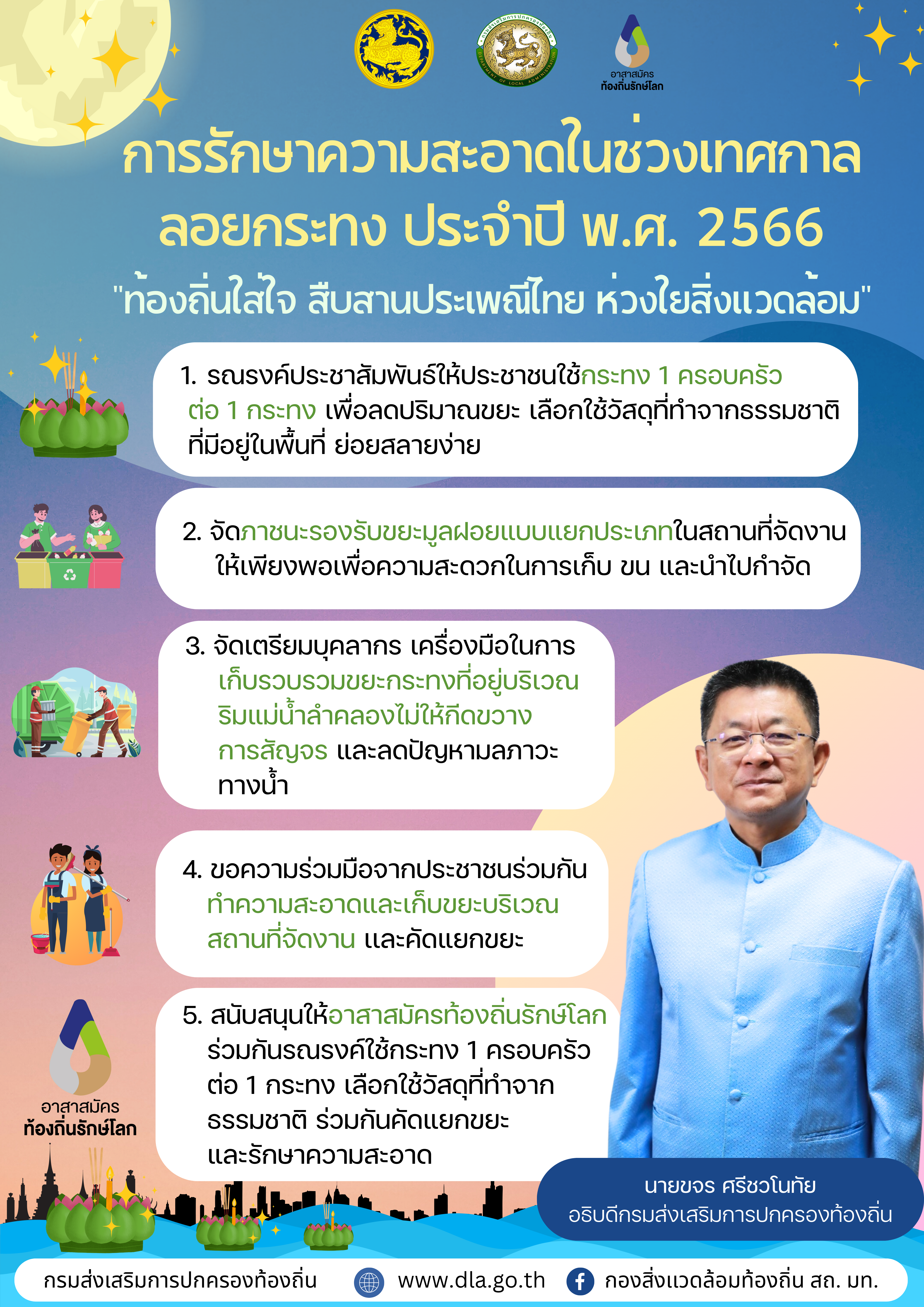 ด้วยทางกรมส่งเสริมการปกครองท้องถิ่น รณรงค์ให้ประชาชนใช้กระทง 1 ครอบครัวต่อ 1 กระทง เลือกใช้วัสดุที่ทำจากธรรมชาติ ร่วมกันคัดแยกขยะ และรักษาความสะอาด
