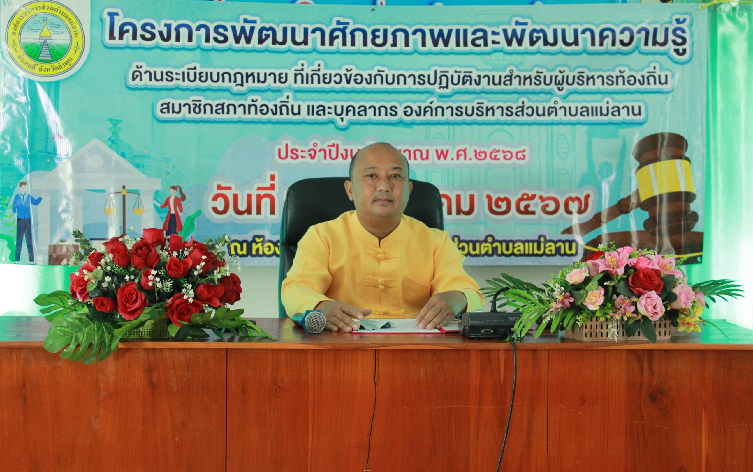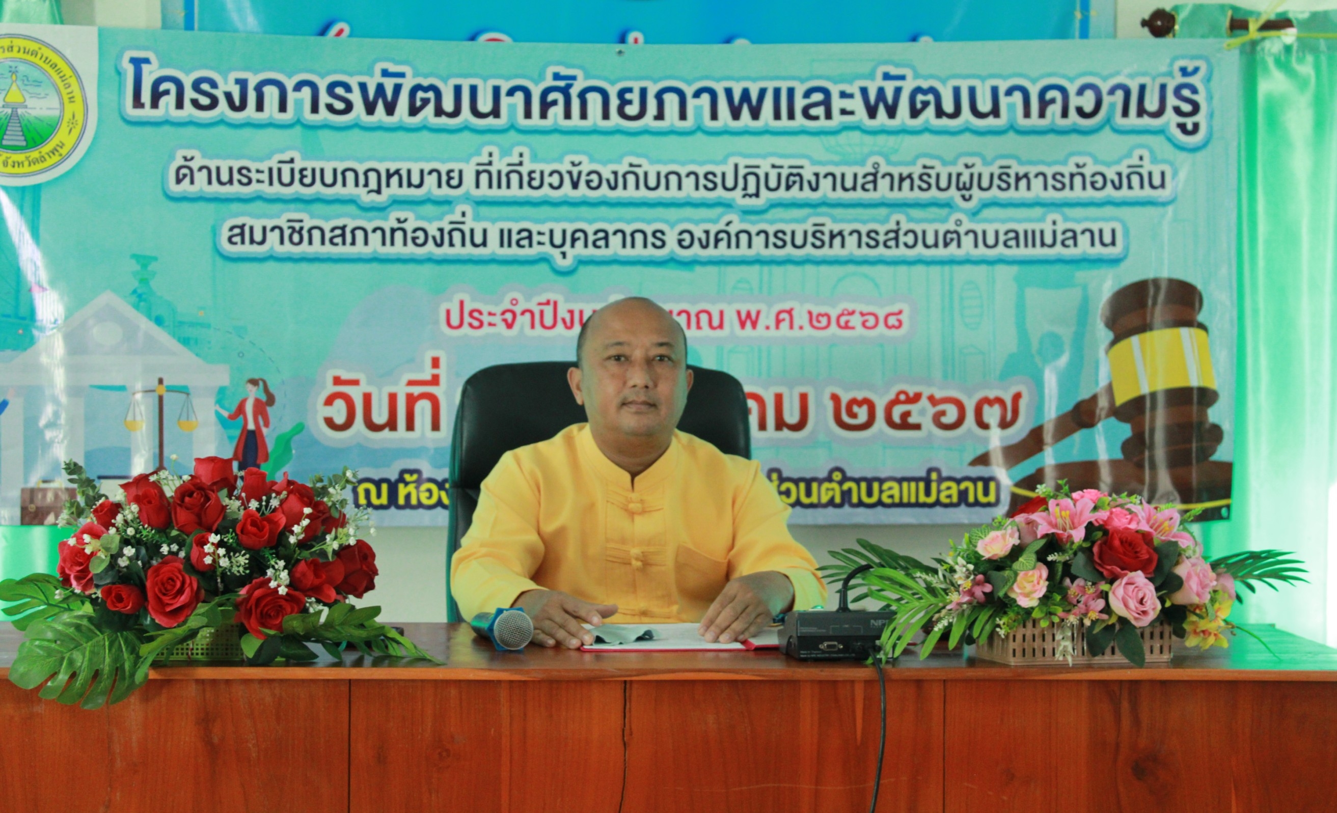 ชื่อเรื่อง : อบรมและประชุมเชิงปฎิบัติการโครงการพัฒนาศักยภาพและพัฒนาความรู้ด้านระเบียบกฎหมายที่เกี่ยวข้องกับการปฏิบัติงาน และมอบนโยบาย No Gift Policy การไม่รับของขวัญและของกำนัลทุกชนิดจากการปฎิบัติหน้าที่ สำหรับผู้บริหารส่วนท้องถิ่น สมาชิกสภาท้องถิ่นและบุคลากรองค์การบริหารส่วนตำบลแม่ลาน ประจำปีงบประมาณ พ.ศ.2568
