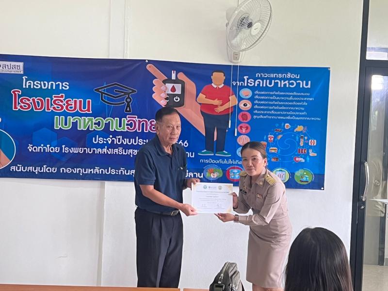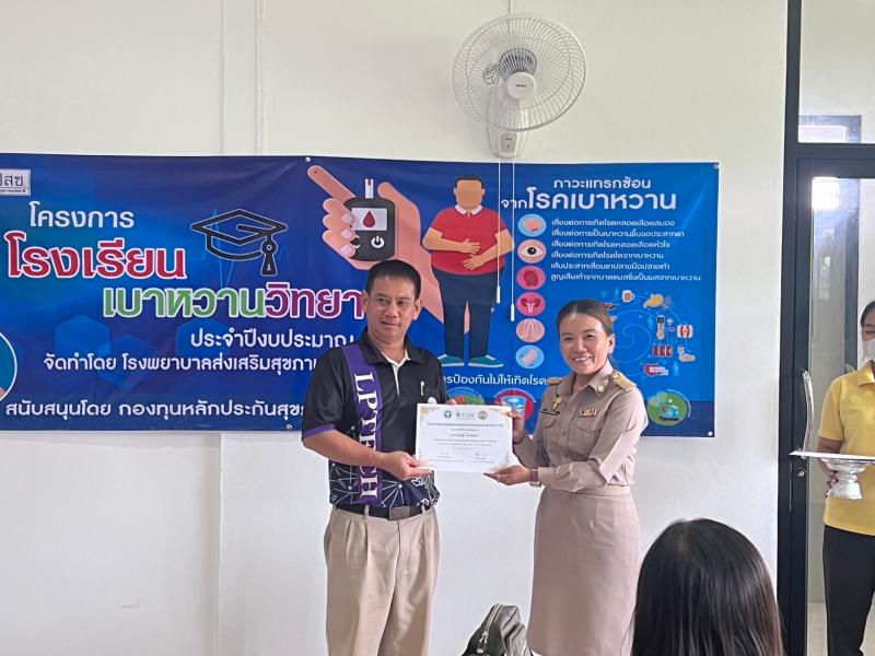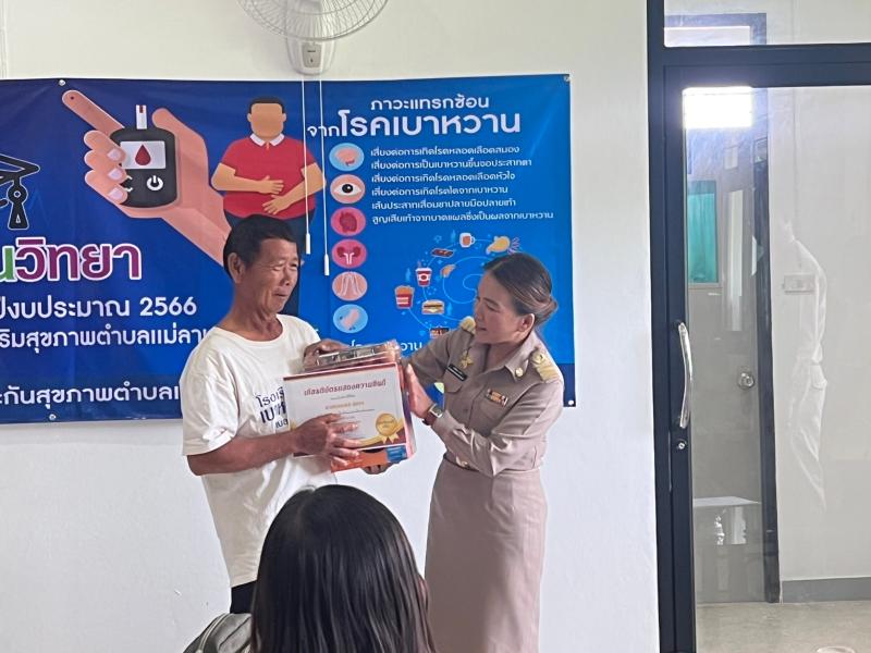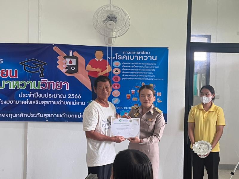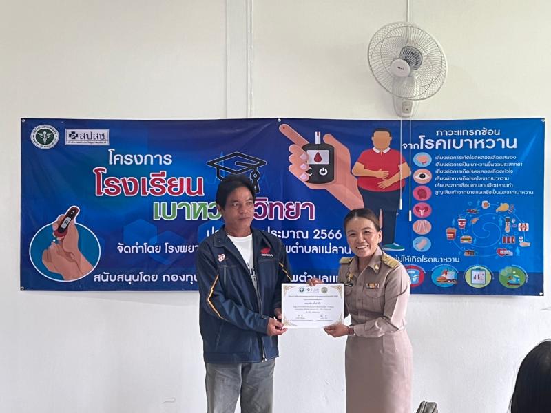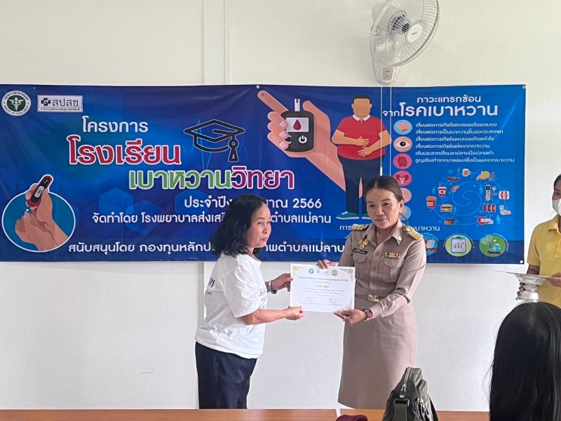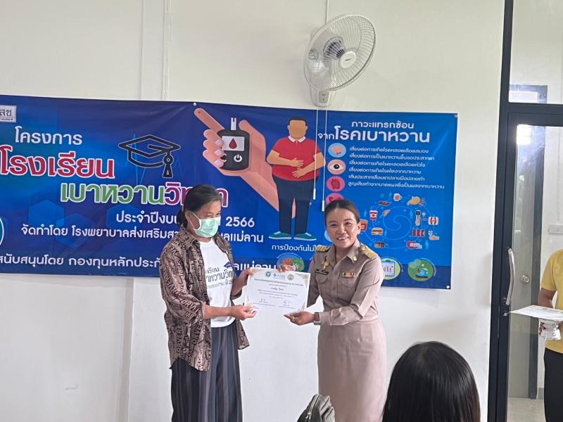 วันที่ 30 ตุลาคม 2566 เวลา 09.00 น. องค์การบริหารส่วนตำบลแม่ลาน โดย นายโสภณ มีมัง นายกองค์การบริหารส่วนตำบลแม่ลาน มอบหมายให้ นางชนันนิดา คำทา รองนายกองค์การบริหารส่วนตำบลแม่ลาน พร้อมด้วย นายประวิทย์ ล่าเพ็ง ผู้อำนวยการกองการศึกษาองค์การบริหารส่วนตำบลแม่ลาน นางสอิงคราทย์ สังพิชัย นักพัฒนาชุมชน นางสาวนริศรา ใจสุยะ เจ้าพนักงานสาธารณสุขปฏิบัติงาน นายเอนก สีวิจี๋ ผู้ช่วยนักวิเคราะห์นโยบายและแผน และเจ้าหน้าที่องค์การบริหารส่วนตำบลแม่ลาน ร่วมพิธีปิดโครงการโรงเรียนเบาหวานวิทยาตำบลแม่ลาน พร้อมมอบใบประกาศนียบัตรให้นักเรียน โดยมี นางชนันนิดา คำทา รองนายกองค์การบริหารส่วนตำบลแม่ลาน เป็นประธานในพิธีฯ แทนนายกองค์การบริหารส่วนตำบลแม่ลาน ณ ห้องประชุมโรงพยาบาลส่งเสริมสุขภาพตำบลแม่ลาน อำเภอลี้ จังหวัดลำพูน