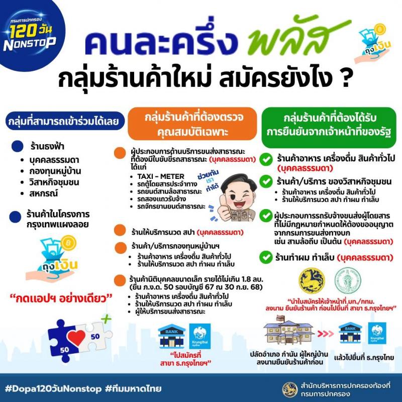 #คนละครึ่งพลัส พร้อมกันรึยัง!!!!! องค์การบริหารส่วนตำบลแม่ลาน เชิญชวนเตรียมความพร้อม เข้าร่วมโครงการ คนละครึ่งพลัส #รัฐจ่ายครึ่งนึงเราจ่ายครึ่งนึง เตรียมเน็ต ลงแอป ลงทะเบียน เริ่มลงทะเบียน 20-26 ต.ค. 68 ร้านค้าใหม่ เริ่มลงทะเบียน 15 ต.ค. 68 ****เริ่มใช้จ่ายได้ 29 ต.ค. 68**** หมายเหตุ : ตรวจสอบรายละเอียด คุณสมบัติ วิธีการลงทะเบียน ข้อสงสัยต่างๆ เพิ่มเติมได้ที่เวปไซต์ คนละครึ่งพลัส