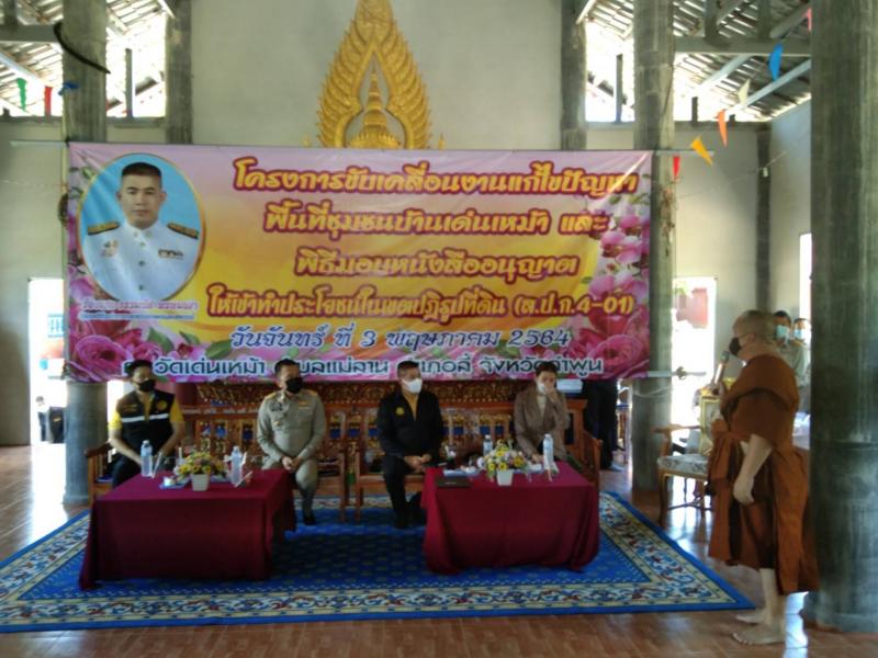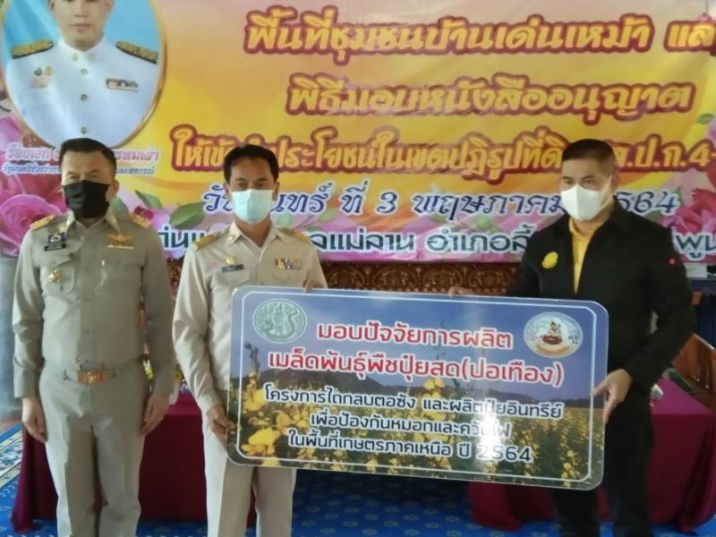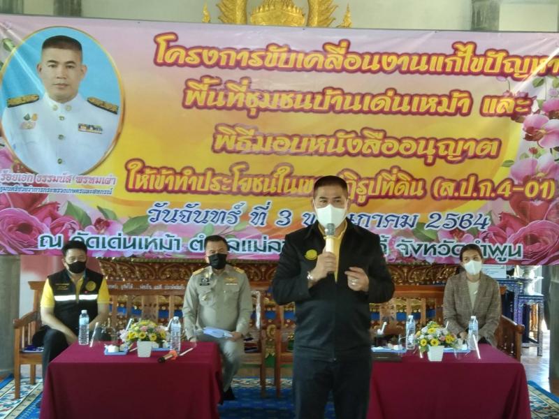 วันที่ 3 พฤษภาคม 2564 นายกุศล ยะทา นายกองค์การบริหารส่วนตำบลแม่ลาน พร้อมด้วยนายวิวัฒน์ จันทร์โอภาส นายอำเภอลี้ และนายวรยุทธ เนาวรัตน์ ผู้ว่าราชการจังหวัดลำพูน ให้การต้อนรับนายธรรมนัส พรหมเผ่า รัฐมนตรีช่วยว่าการกระทรวงเกษตรและสหกรณ์ ในการดำเนินโครงการงานขับเคลื่อนการแก้ไขปัญหาพื้นที่ชุมชนบ้สนเด่นเหม้า ตำบลแม่ลาน และพิธีมอบหนังสืออนุญาตให้เข้าทำประโยชน์ในพื้นที่เขตปฏิรูปที่ดิน (ศ.ป.ก. 4-01) ณ บ้านเด่นเหม้า ตำบลแม่ลาน อำเภอลี้ จังหวัดลำพูน