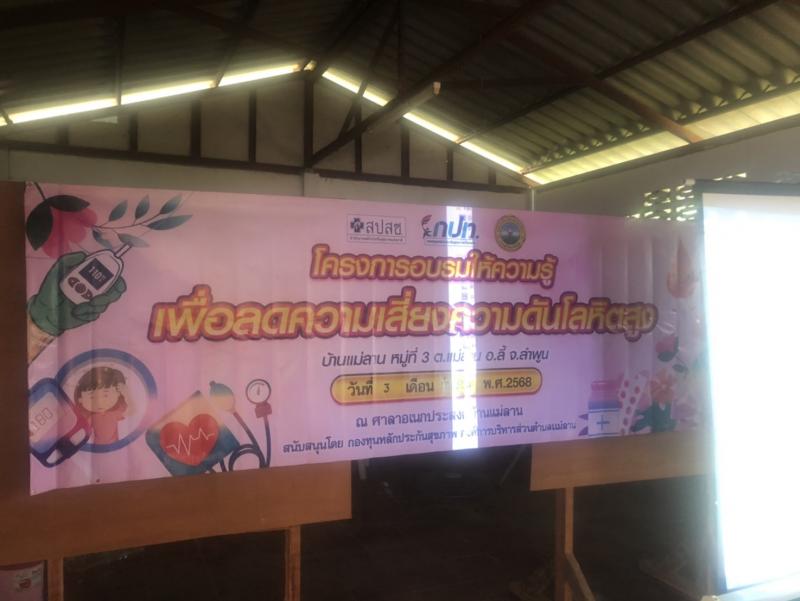 ณ ศาลาอเนกประสงค์ประจำหมู่บ้าน บ้านแม่ลาน หมู่ที่ 3 ตำบลแม่ลาน อำเภอลี้ จังหวัดลำพูน สนับสนุนโดย กองทุนหลักประกันสุขภาพฯ องค์การบริหารส่วนตำบลแม่ลาน
