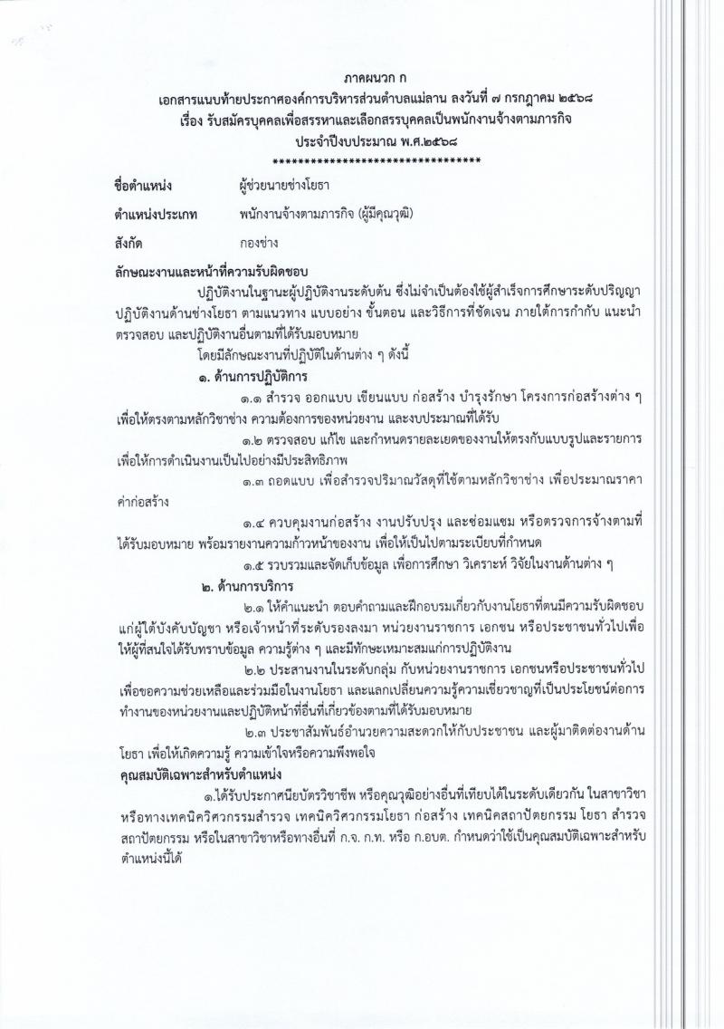 ประกาศองค์การบริหารส่วนตำบลแม่ลานรับสมัครบุคคลเพื่อสรรหาและเลือกสรรเป็นพนักงานจ้างตามภารกิจ ประจำปีงบประมาณ พ.ศ. 2568 ตำแหน่ง ผู้ช่วยนายช่างโยธา จำนวน 1 อัตรา