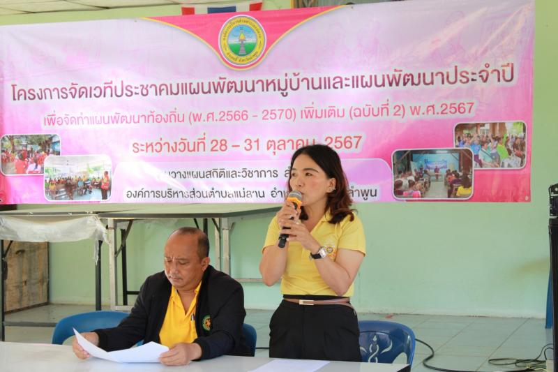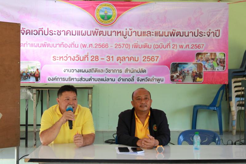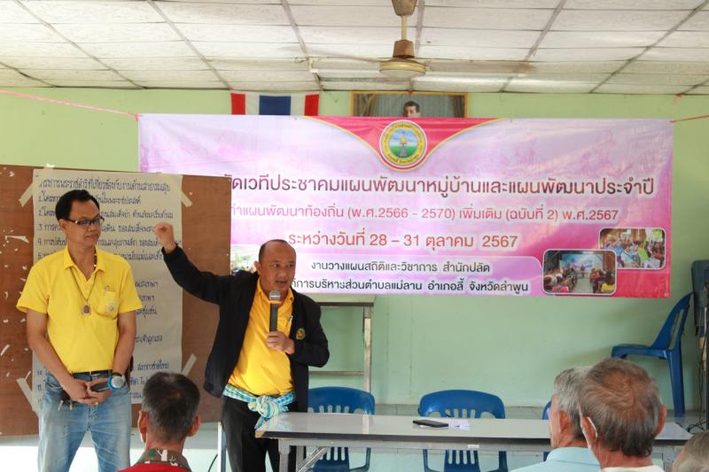 วันที่ 28 ตุลาคม 2567 เวลา 09.00 น. องค์การบริหารส่วนตำบลแม่ลาน นำโดย นายโสภณ มีมัง นายกองค์การบริหารส่วนตำบลแม่ลาน พร้อมด้วยคณะผู้บริหาร ข้าราชการ พนักงาน และเจ้าที่องค์การบริหารส่วนตำบลแม่ลาน ร่วมจัดโครงการจัดเวทีประชาคมทบทวนแผนพัฒนาหมู่บ้านและแผนพัฒนาประจำปี เพื่อจัดทำแผนท้องถิ่น (พ.ศ. 2566-2570) เพิ่มเติม (ฉบับที่ 2) พ.ศ. 2567 ขององค์การบริหารส่วนตำบลแม่ลาน ให้เป็นไปตามระเบียบกระทรวงมหาดไทย ว่าด้วยการจัดทำแผนพัฒนาขององค์กรปกครองส่วนท้องถิ่น พ.ศ.2548 แก้ไขเพิ่มเติม (ฉบับที่ 3) พ.ศ.2561 เป็นการส่งเสริมการมีส่วนร่วมของประชาชน ในการจัดทำแผนของชุมชน ณ บ้านผาต้ายเหนือ หมู่ที่ 6 ตำบลแม่ลาน อำเภอลี้ จังหวัดลำพูน