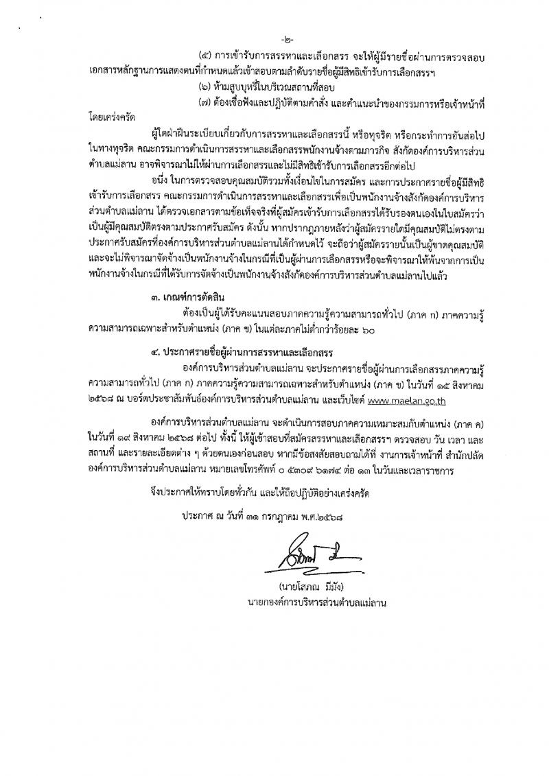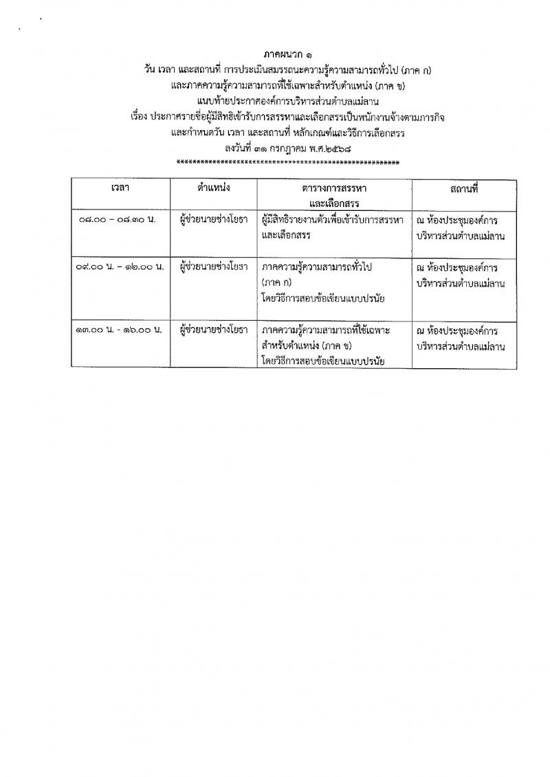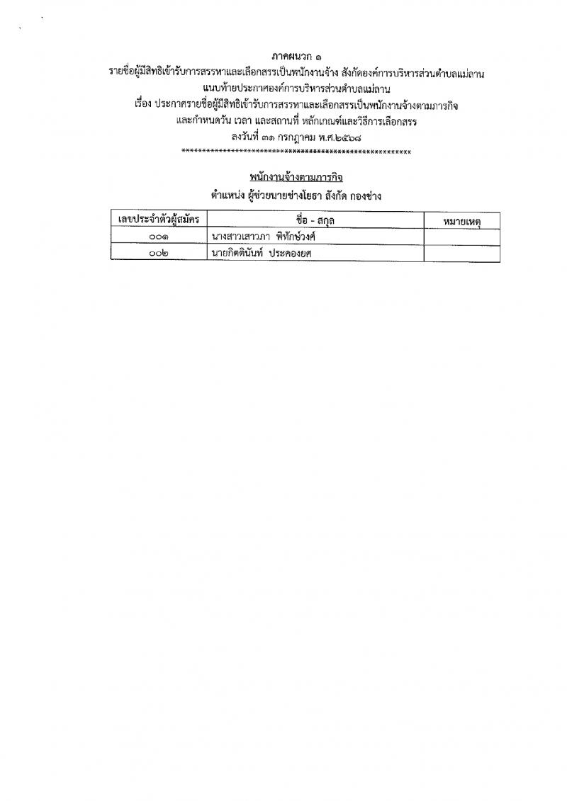 ประกาศรายชื่อผู้มีสิทธิเข้ารับการสรรหาและเลือกสรรเป็นพนักงานจ้างตามภารกิจ สังกัดองค์การบริหารส่วนตำบลแม่ลาน และกำหนดวัน เวลา สถานที่ หลักเกณฑ์และวิธีการเลือกสรร ประจำปีงบประมาณ พ.ศ. 2568