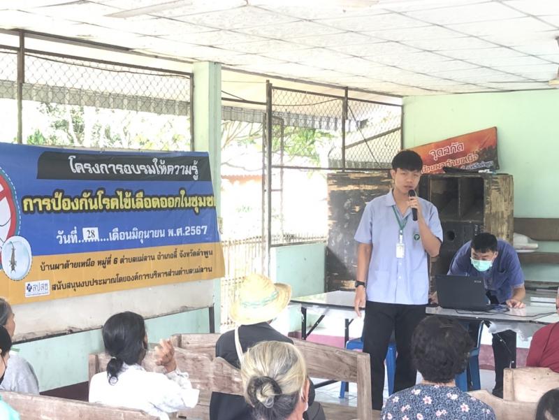 วันที่ 28 มิถุนายน 2567 เวลา 09.00 น. องค์การบริหารส่วนตำบลแม่ลาน นำโดย นายโสภณ มีมัง นายกองค์การบริหารส่วนตำบลแม่ลาน พร้อมด้วยคณะผู้บริหาร ผู้อำนวยการกองการศึกษา และผู้ช่วยนักวิเคราะห์นโยบายและแผนองค์การบริหารส่วนตำบลแม่ลาน เข้าร่วมโครงการอบรมให้ความรู้ การป้องกันโรคไข้เลือดออกในชุมชน โดยมี นายโสภณ มีมัง นายกองค์การบริหารส่วนตำบลแม่ลาน เป็นประธานในพิธีเปิดโครงการฯ ดังกล่าว ณ ศาลากลางประจำหมู่บ้าน บ้านผาต้ายเหนือ หมู่ที่ 6 ตำบลแม่ลาน อำเภอลี้ จังหวัดลำพูน สนับสนุนงบประมาณโดย สนับสนุนงบประมาณโดย กองทุนหลักประกันสุขภาพฯ องค์การบริหารส่วนตำบลแม่ลาน