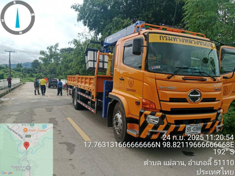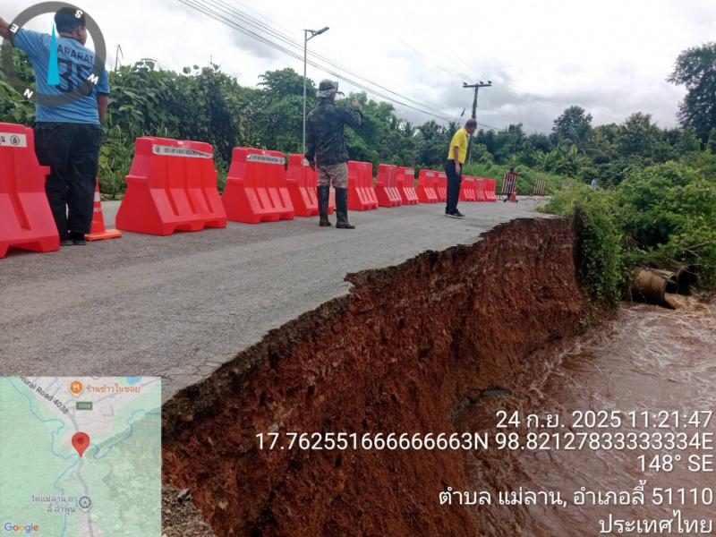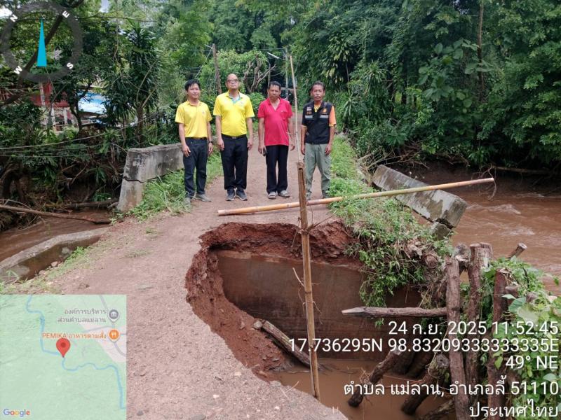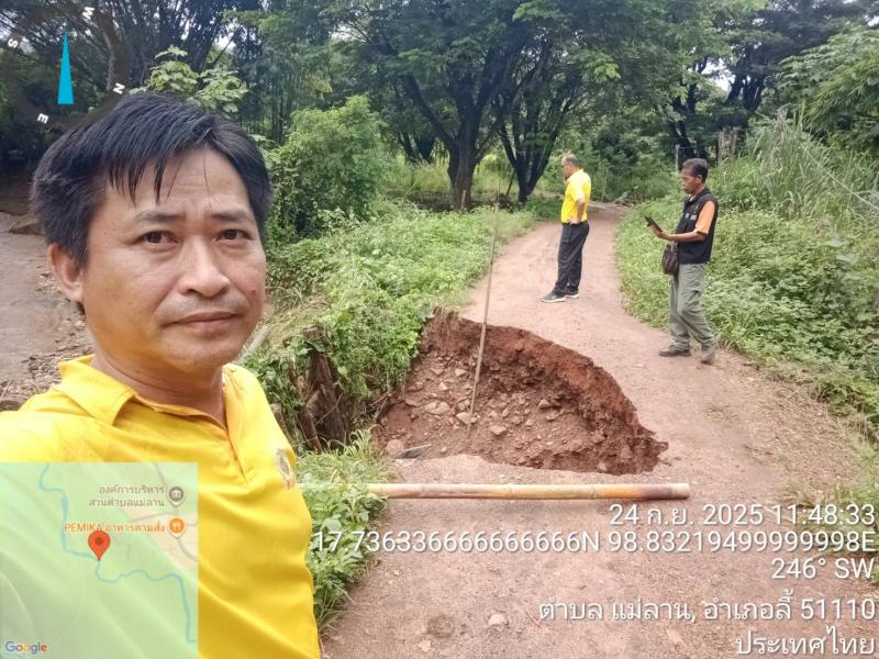 ลงพื้นที่สำรวจความเสียหายจากอุทกภัย บริเวณถนนทางหลวงชนบทสาย ลพ 4038 บริเวณสะพานข้ามห้วยแม่ลาน บ้านแม่ลาน หมู่ที่ 3 ถนนชำรุด 1 ช่องทางจราจร และบริเวณสะพานข้ามห้วยแม่หาด บ้านห้วยทรายขาว หมู่ที่ 7 ตำบลแม่ลาน อำเภอลี้ จังหวัดลำพูน เนื่องจากมีฝนตกหนัก น้ำป่าไหลหลากในพื้นที่ตำบลแม่ลาน เพื่อดำเนินการแก้ไขปัญหาเบื้องต้นในช่วงฤดูฝน