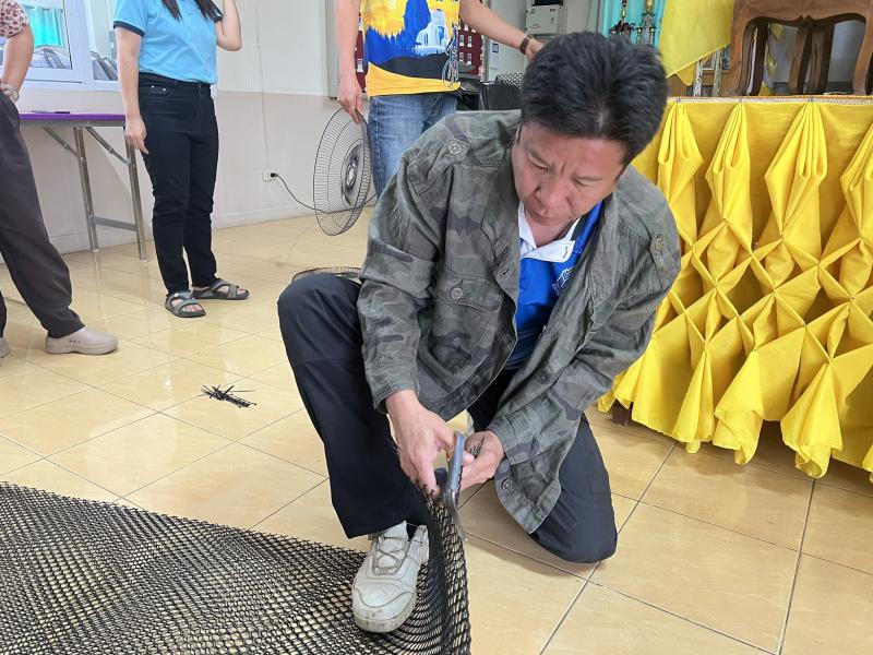 2.นำตะแกรงฝาปิดใบพัดลมมาวางให้พอดีขอบตาข่ายพลาสติกโดยให้ด้านนูนของตะแกรงฝาปิดใบพัดลมอยู่ด้านใน แล้วใช้สายรัดหรือลวดผูกมัดตระแกรงกับตาข่ายให้ติดกัน ให้รอบตระแกรงฝาปิดพัดลม